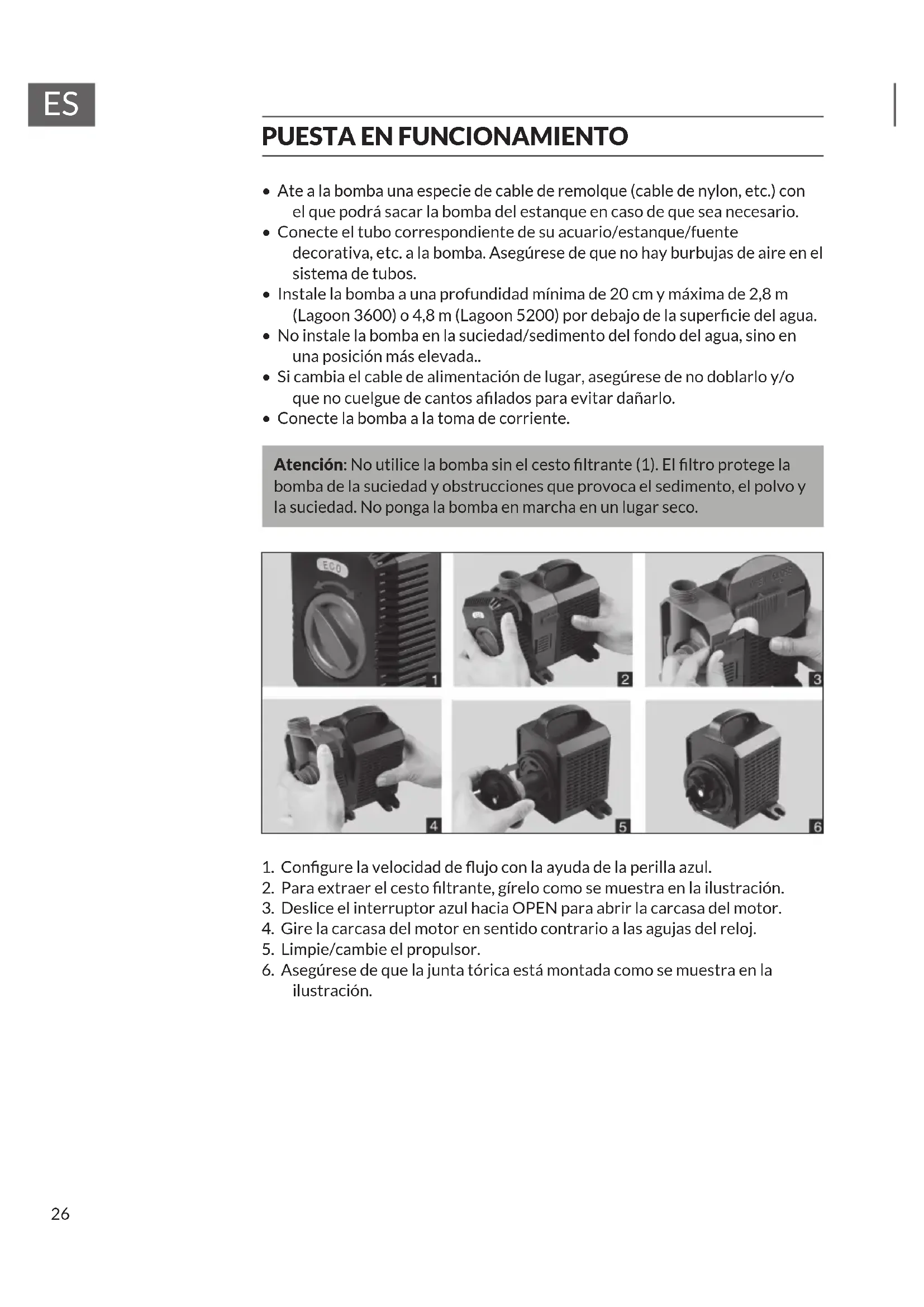 - Utilice la bomba en un estanque de agua dulce a una temperatura máxima de 50 °C.