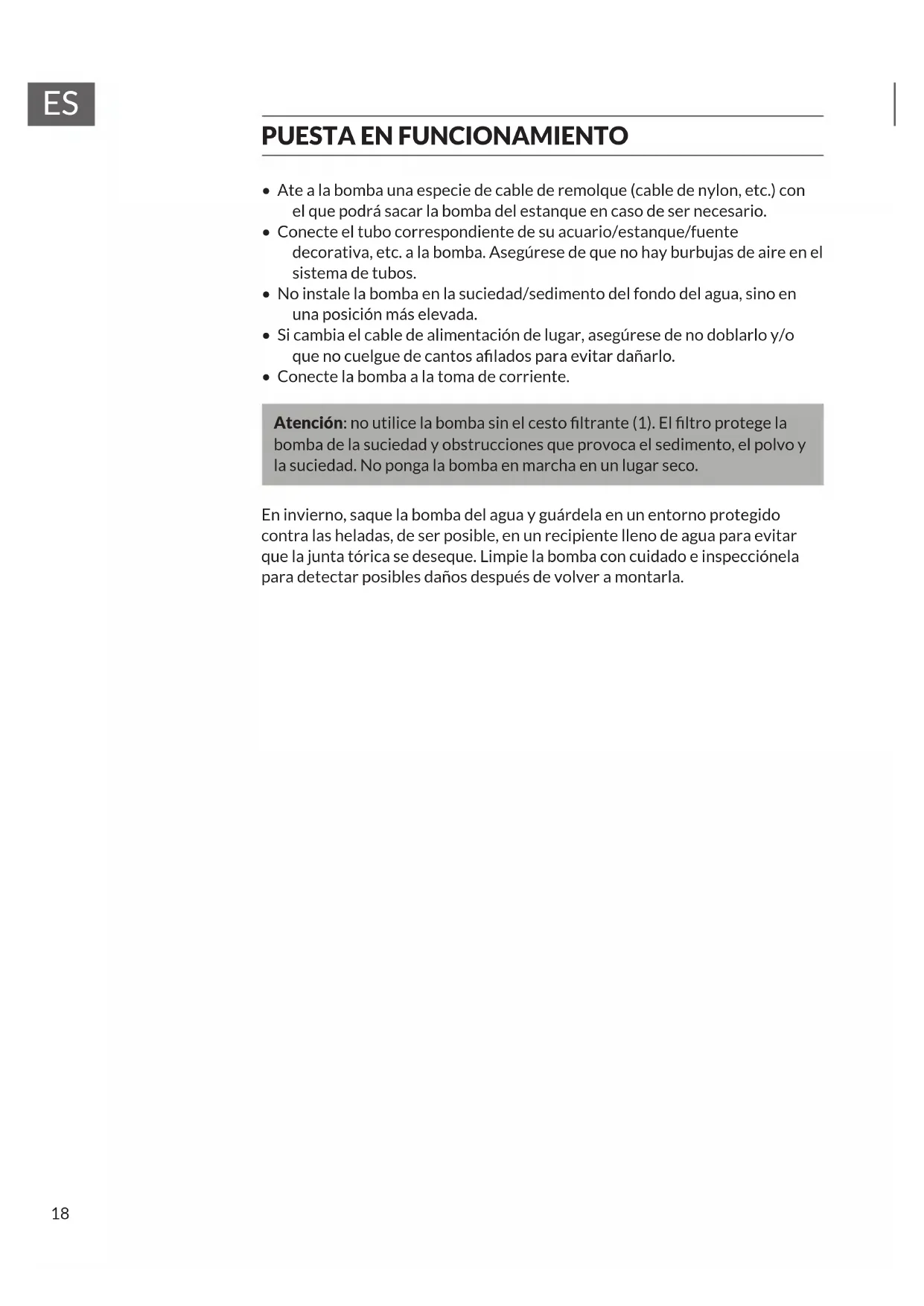 - Utilice la bomba en un estanque de agua dulce a una temperatura máxima de 50 °C.