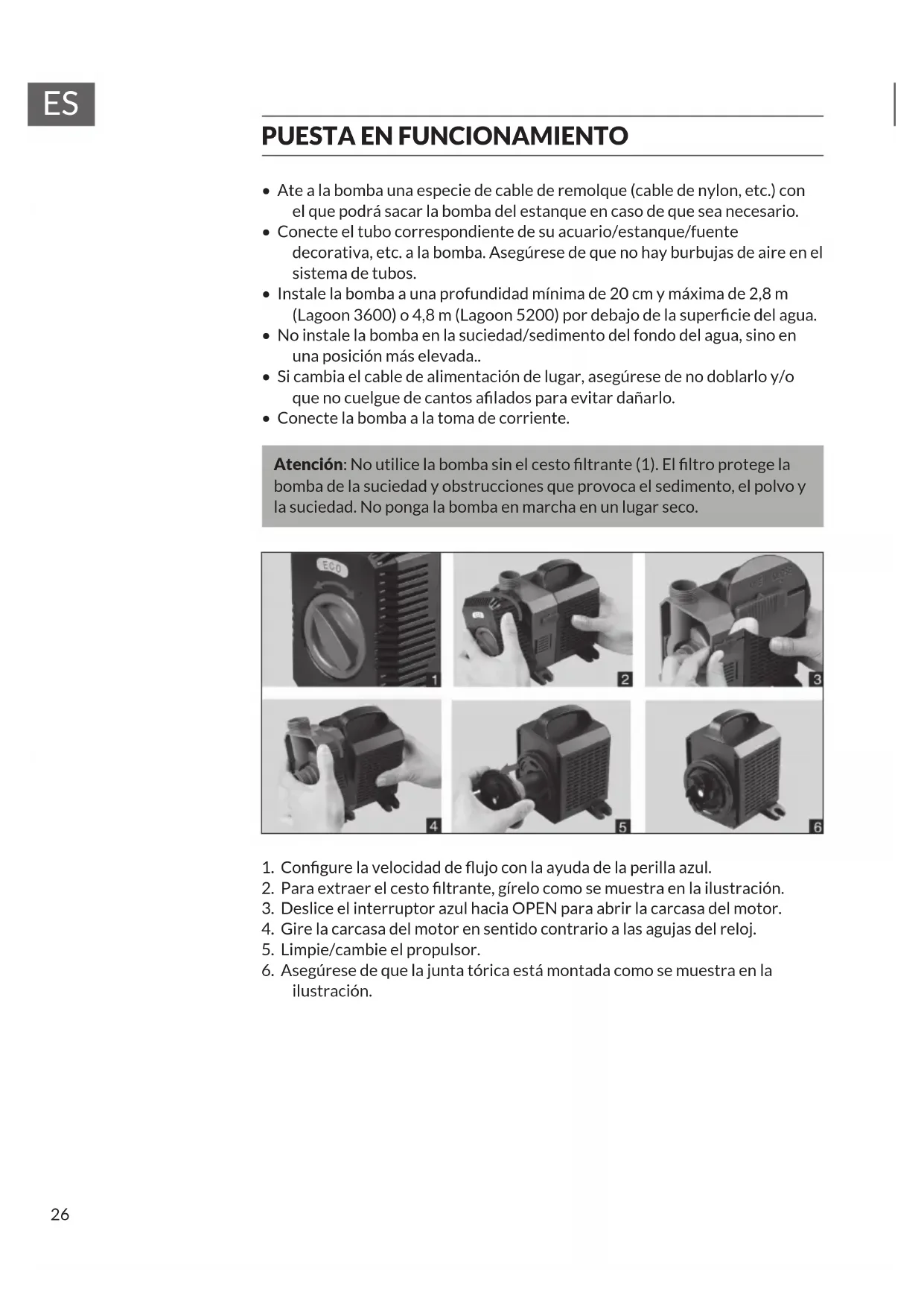 - La bomba está concebida para utilizarse con ltros de estanque, cascadas, fuentes decorativas o ltros de acuario. ADVERTENCIA ¡Riesgo de lesiones! No abra la carcasa del motor, ya que existe peligro de muerte.25