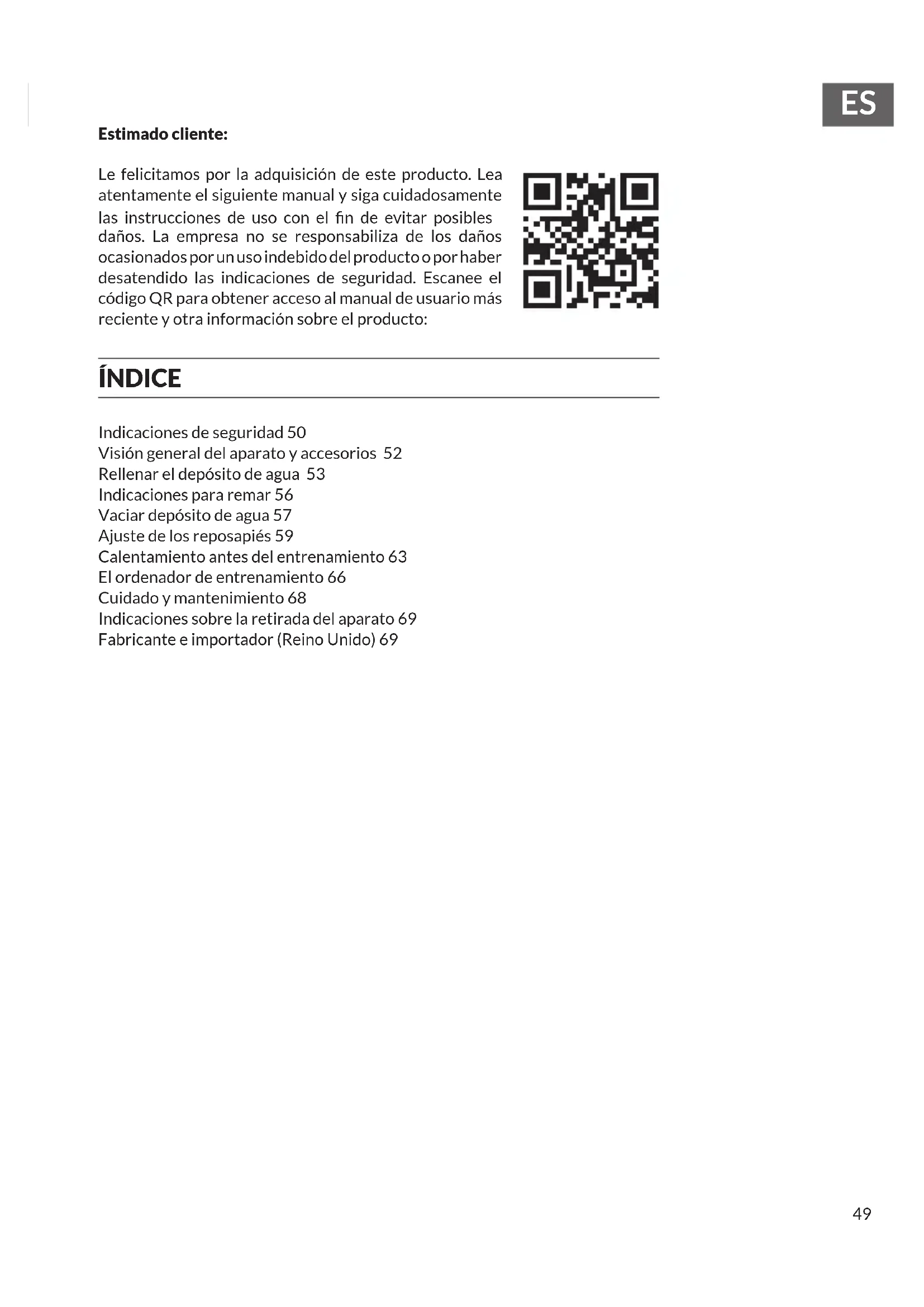 Estimado cliente: Le felicitamos por la adquisición de este producto. Lea atentamente el siguiente manual y siga cuidadosamente las instrucciones de uso con el n de evitar posibles daños. La empresa no se responsabiliza de los daños ocasionados por un uso indebido del producto o por haber desatendido las indicaciones de seguridad. Escanee el código QR para obtener acceso al manual de usuario más reciente y otra información sobre el producto: ÍNDICE Indicaciones de seguridad 50 Visión general del aparato y accesorios 52 Rellenar el depósito de agua 53 Indicaciones para remar 56 Vaciar depósito de agua 57 Ajuste de los reposapiés 59 Calentamiento antes del entrenamiento 63 El ordenador de entrenamiento 66 Cuidado y mantenimiento 68 Indicaciones sobre la retirada del aparato 69 Fabricante e importador (Reino Unido) 6950