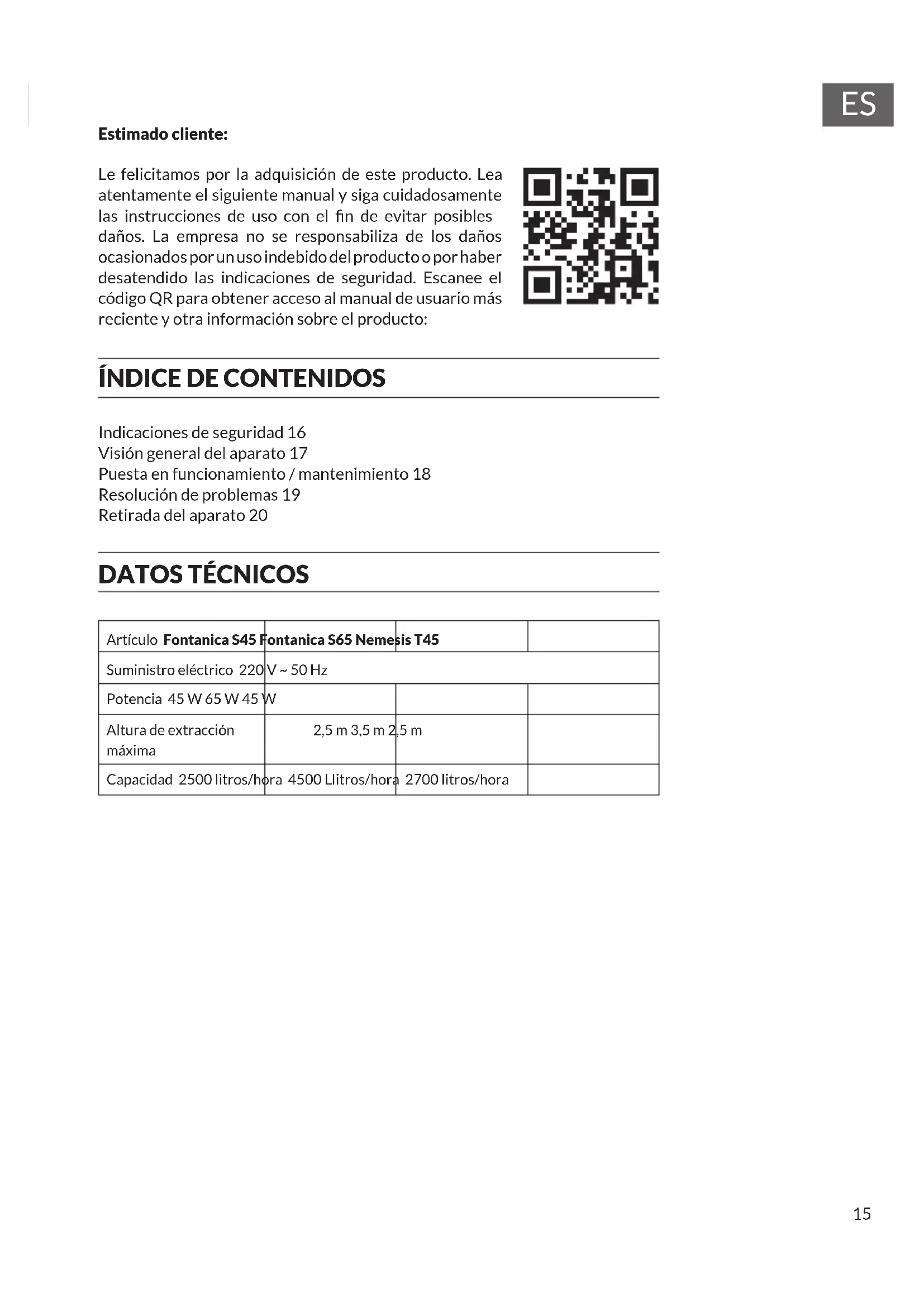 Artículo Fontanica S45 Fontanica S65 Nemesis T45 Suministro eléctrico 220 V ~ 50 Hz Potencia 45 W 65 W 45 W Altura de extracción máxima 2,5 m 3,5 m 2,5 m Capacidad 2500 litros/hora 4500 Llitros/hora 2700 litros/hora16