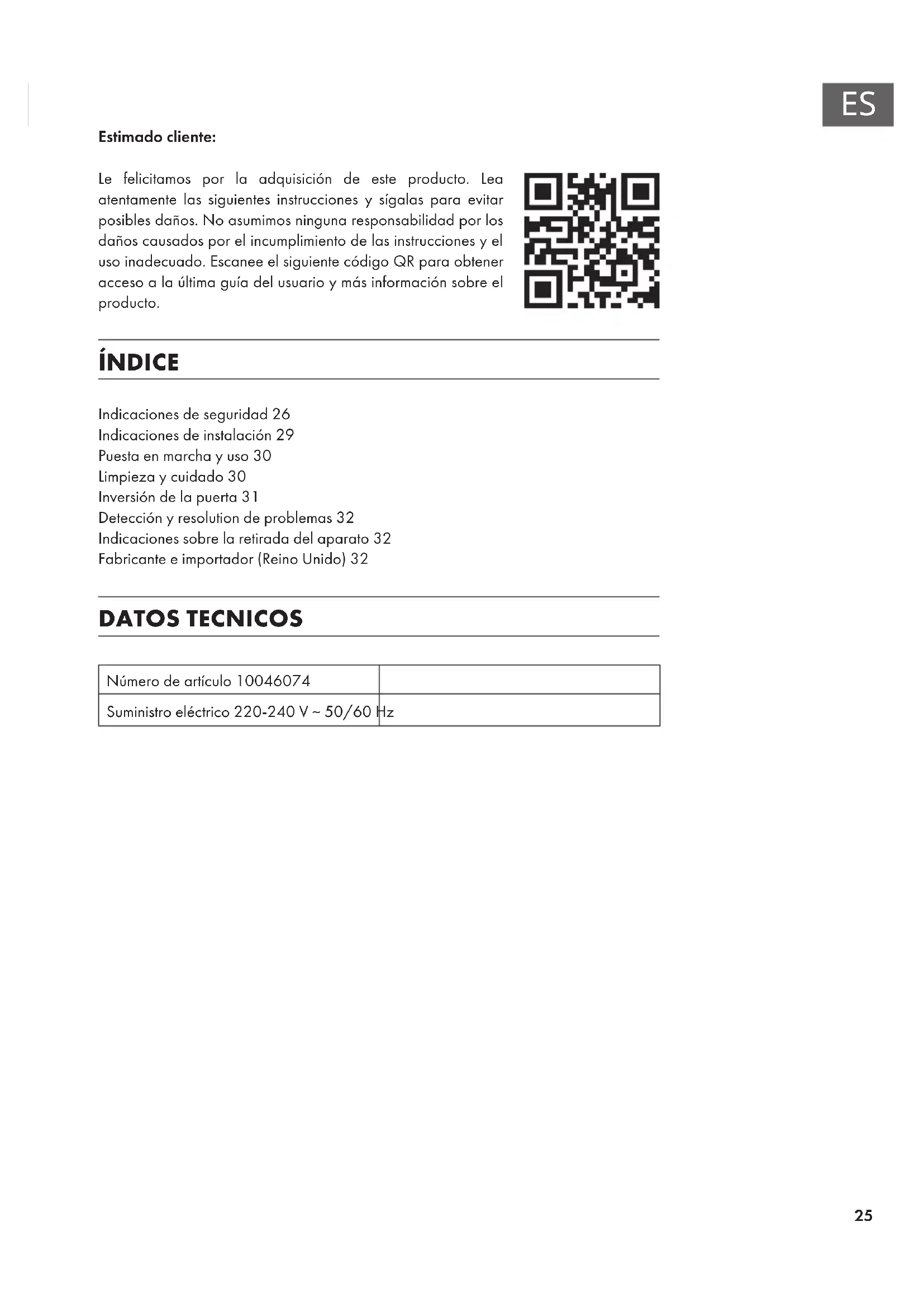 Estimado cliente: Le felicitamos por la adquisición de este producto. Lea atentamente las siguientes instrucciones y sígalas para evitar posibles daños. No asumimos ninguna responsabilidad por los daños causados por el incumplimiento de las instrucciones y el uso inadecuado. Escanee el siguiente código QR para obtener acceso a la última guía del usuario y más información sobre el producto. ÍNDICE Indicaciones de seguridad26 Indicaciones de instalación29 Puesta en marcha y uso30 Limpieza y cuidado30 Inversión de la puerta31 Detección y resolution de problemas32 Indicaciones sobre la retirada del aparato32 Fabricante e importador (Reino Unido)32 DATOS TECNICOS Número de artículo 10046074 Suministro eléctrico 220-240 V ~ 50/60 Hz26
