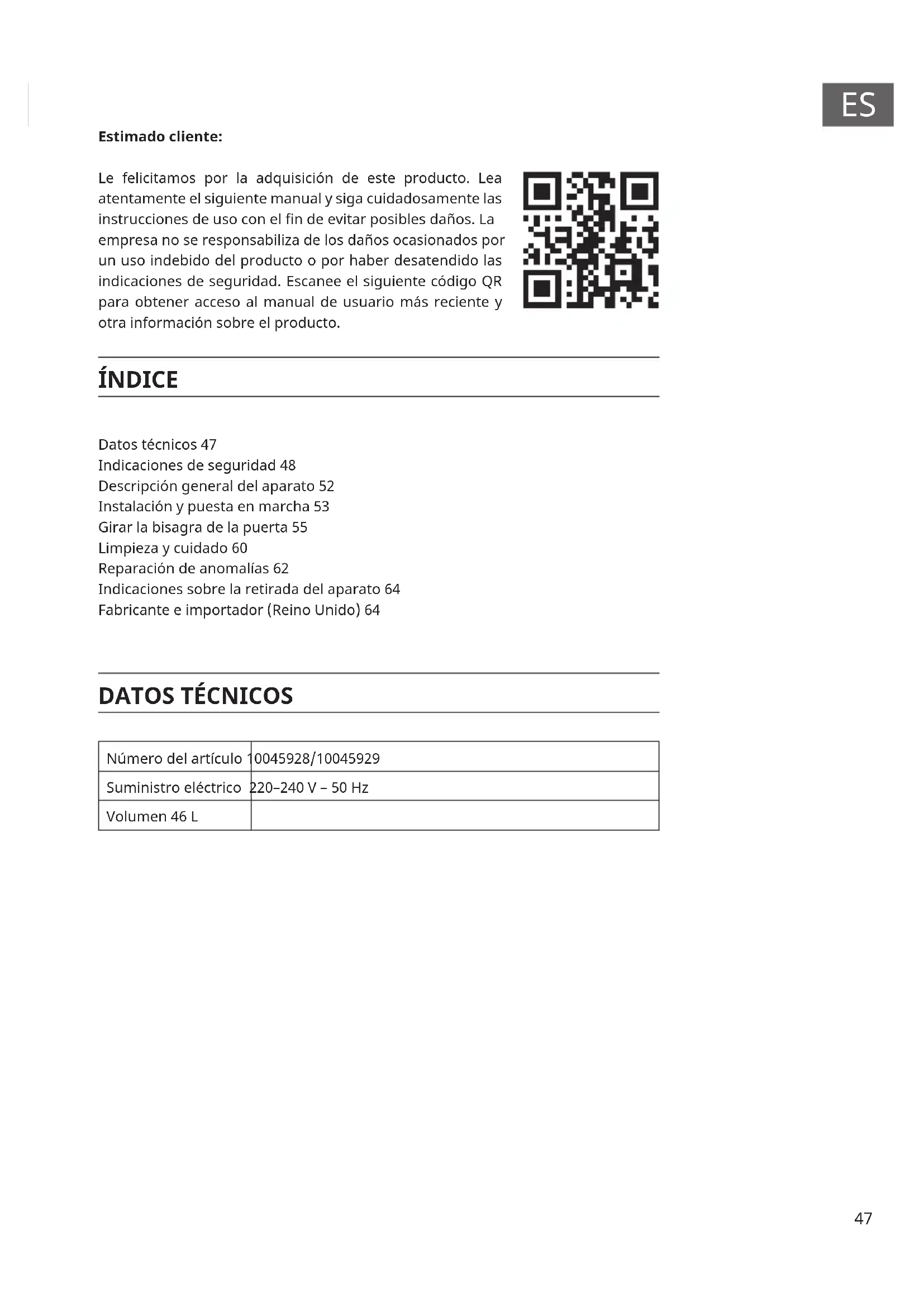 Número del artículo 10045928/10045929 Suministro eléctrico 220–240 V – 50 Hz Volumen 46 L Datos técnicos 47 Indicaciones de seguridad 48 Descripción general del aparato 52 Instalación y puesta en marcha 53 Girar la bisagra de la puerta 55 Limpieza y cuidado 60 Reparación de anomalías 62 Indicaciones sobre la retirada del aparato 64 Fabricante e importador (Reino Unido) 6448