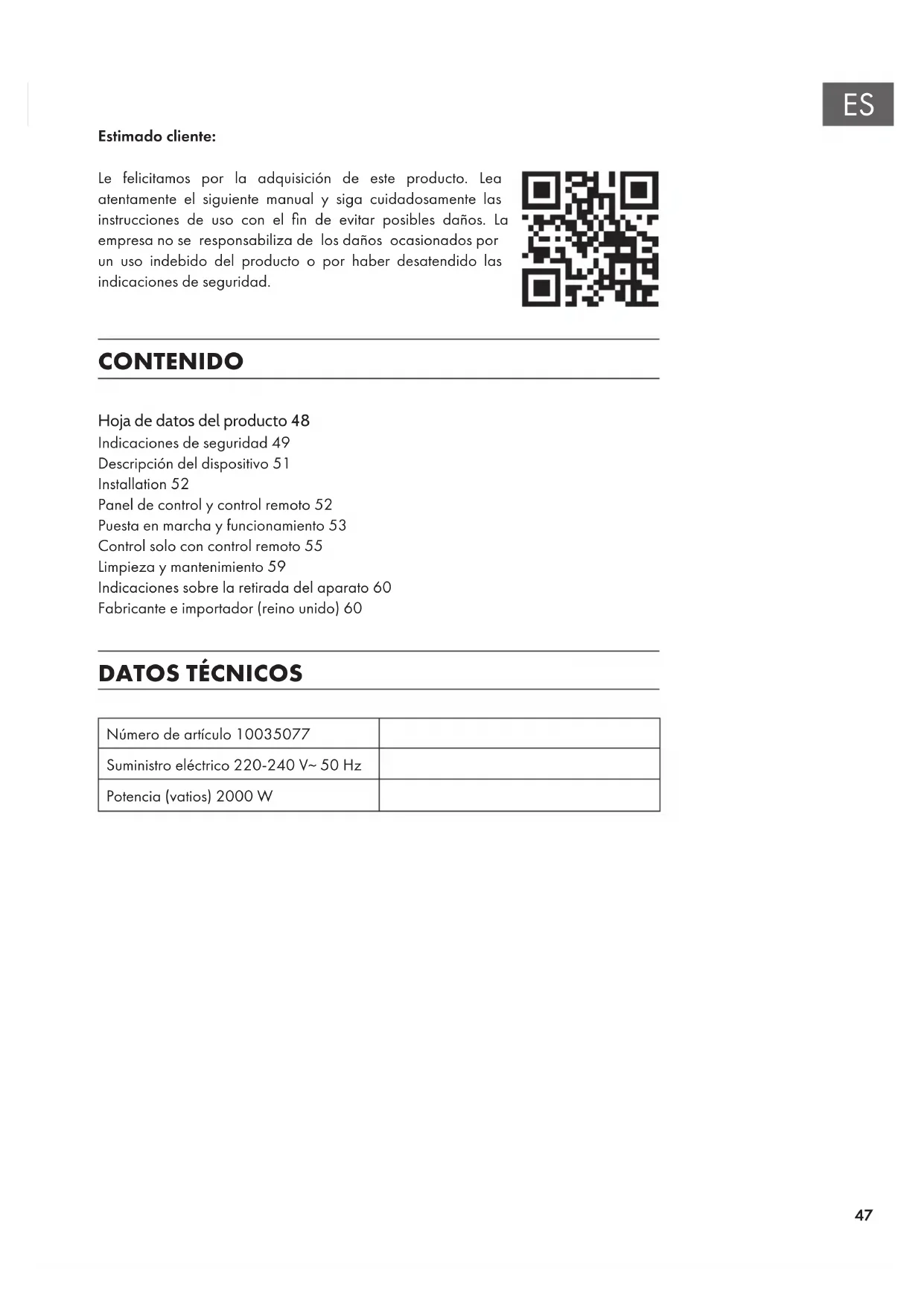Número de artículo 10035077 Suministro eléctrico 220-240 V~ 50 Hz Potencia (vatios) 2000 W Hoja de datos del producto 48 Indicaciones de seguridad49 Descripción del dispositivo51 Installation52 Panel de control y control remoto52 Puesta en marcha y funcionamiento53 Control solo con control remoto55 Limpieza y mantenimiento59 Indicaciones sobre la retirada del aparato60 Fabricante e importador (reino unido)6048
