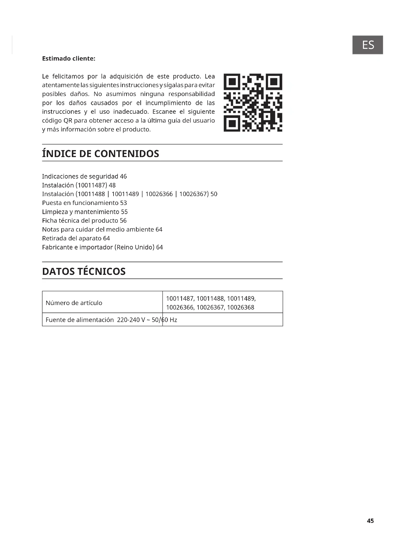 Indicaciones de seguridad 46 Instalación (10011487) 48 Instalación (10011488 | 10011489 | 10026366 | 10026367) 50 Puesta en funcionamiento 53 Limpieza y mantenimiento 55 Ficha técnica del producto 56 Notas para cuidar del medio ambiente 64 Retirada del aparato 64 Fabricante e importador (Reino Unido) 64