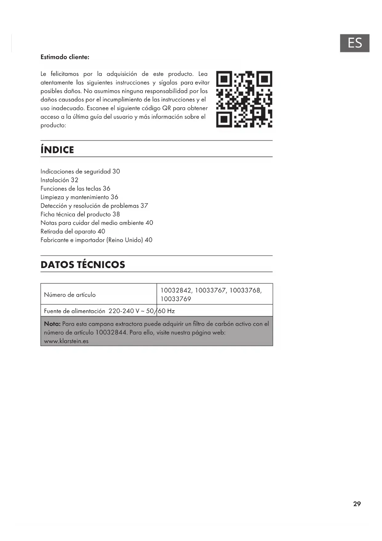 Estimado cliente: Le felicitamos por la adquisición de este producto. Lea atentamente las siguientes instrucciones y sígalas para evitar posibles daños. No asumimos ninguna responsabilidad por los daños causados por el incumplimiento de las instrucciones y el uso inadecuado. Escanee el siguiente código QR para obtener acceso a la última guía del usuario y más información sobre el producto: ÍNDICE Indicaciones de seguridad30 Instalación32 Funciones de las teclas36 Limpieza y mantenimiento36 Detección y resolución de problemas37 Ficha técnica del producto38 Notas para cuidar del medio ambiente40 Retirada del aparato40 Fabricante e importador (Reino Unido)40