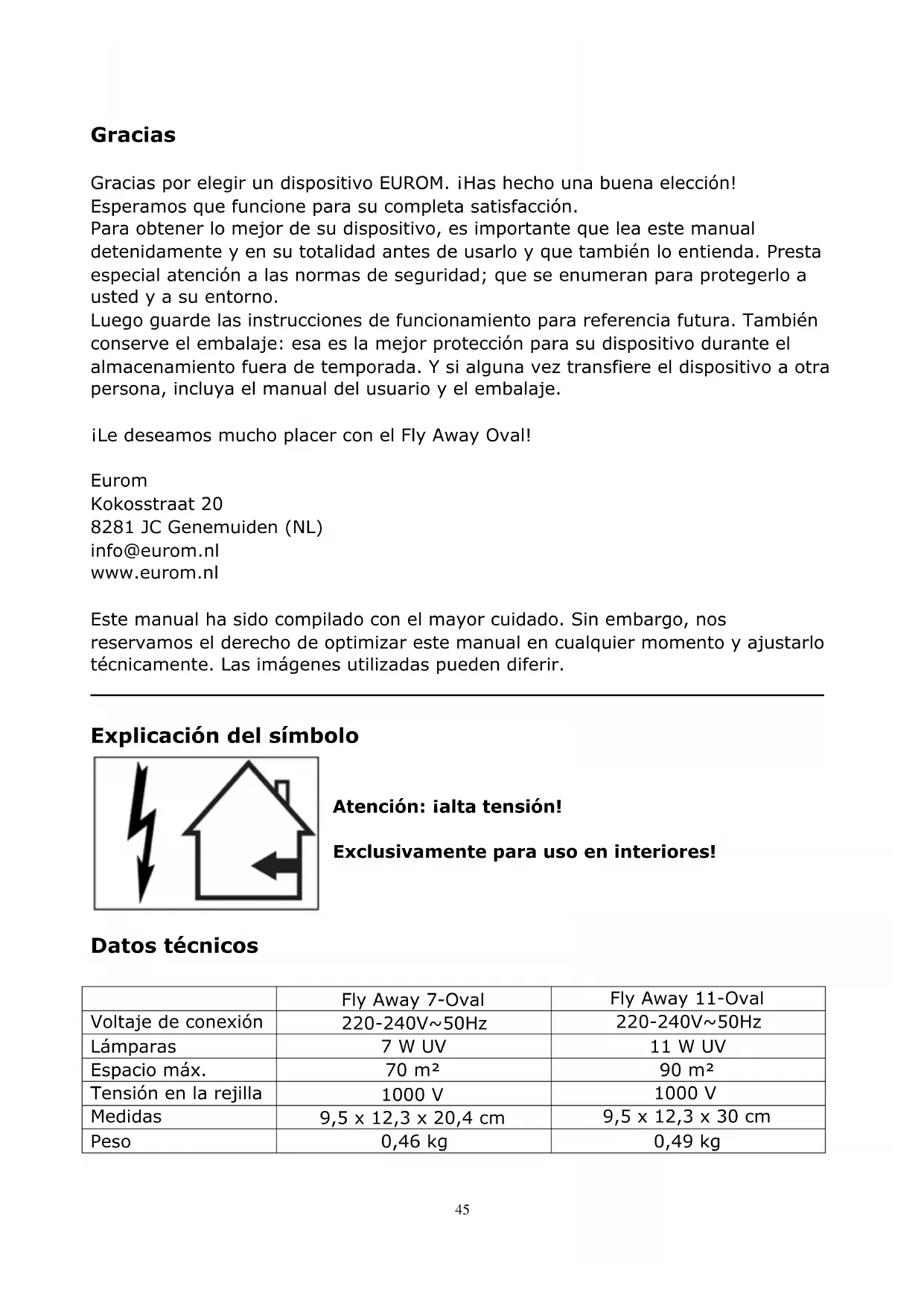 / corrientes de aire. Por lo tanto, colocar al asesino de insectos en la corriente de tiro no será efectivo. Uso Retire todo el material de embalaje. Asegúrese de retirar todo el material de embalaje. Cuelgue el aparato de su anilla de suspensión o sitúelo sobre una base segura y estable. No lo cuelgue jamás por el cable de alimentación. Asegúrese de mantener el aparato fuera del alcance de los niños. Este aparato comenzará su funcionamiento tan pronto como lo enchufe. Conéctelo a una toma de pared de 220-240 V. La red eléctrica a la que enchufe el aparato deberá tener un interruptor de derivación a tierra. Asegúrese siempre de desenchufar el aparato antes de mover, limpiar o acometer cualquier tarea de mantenimiento en él. Limpieza Limpie periódicamente el dispositivo y, concretamente, la rejilla de alta tensión. La falta de limpieza habitual de la rejilla podría ocasionar el mal funcionamiento del aparato. Nunca toque el aparato durante su funcionamiento, a pesar de que su tensión sea inofensiva. ¡Desenchúfelo siempre antes! Descárguese de electricidad estática antes de acometer la limpieza del aparato o cambiar una bombilla; para ello, toque la rejilla con un destornillador aislado. Retire los insectos muertos al menos una vez a la semana. Para ello, gire la parte inferior con el recipiente de recogida abierto, límpielo y vuelva a colocarlo. Utilice un cepillo pequeño para retirar los insectos muertos de la rejilla y bombilla. Pase el cepillo varias veces por distintos lugares de la carcasa plástica. solar directa.49 Eliminación En la UE, este símbolo indica que este producto no puede ser eliminado con los residuos domésticos. Los aparatos desechados contienen materiales de valor que pueden y deben ser reutilizados para evitar dañar el medioambiente y la salud mediante la recogida de residuos no regulada. Lleve aparatos desechados a puntos de recogida destinados para ello o póngase en contacto con la empresa donde compró el aparato. Ellos pueden encargarse de que la mayoría posible de las partes del aparato sea reutilizada. Declaración CE Ver página 55.50 Obrigado Obrigado por escolher um dispositivo EUROM. Você fez uma boa escolha! Esperamos que funcione para sua total satisfação. Para tirar o melhor proveito do seu dispositivo, é importante que você leia este manual com atenção e por inteiro antes de usá-lo e também entendê-lo. Preste atenção especial às normas de segurança; listados para proteger você e seu ambiente! Salve as instruções de operação para referência futura. Guarde também a embalagem: essa é a melhor proteção para o seu dispositivo durante o armazenamento fora da estação. E se você transferir o dispositivo para outra pessoa, inclua o manual do usuário e a embalagem. Desejamos-lhe muito prazer com o Fly Away Oval Eurom Kokosstraat 20 8281 JC Genemuiden (NL) info@eurom.nl www.eurom.nl Este manual foi compilado com o maior cuidado. No entanto, reservamo-nos o direito de otimizar este manual a qualquer momento e de ajustá-lo tecnicamente. As imagens utilizadas podem diferir.