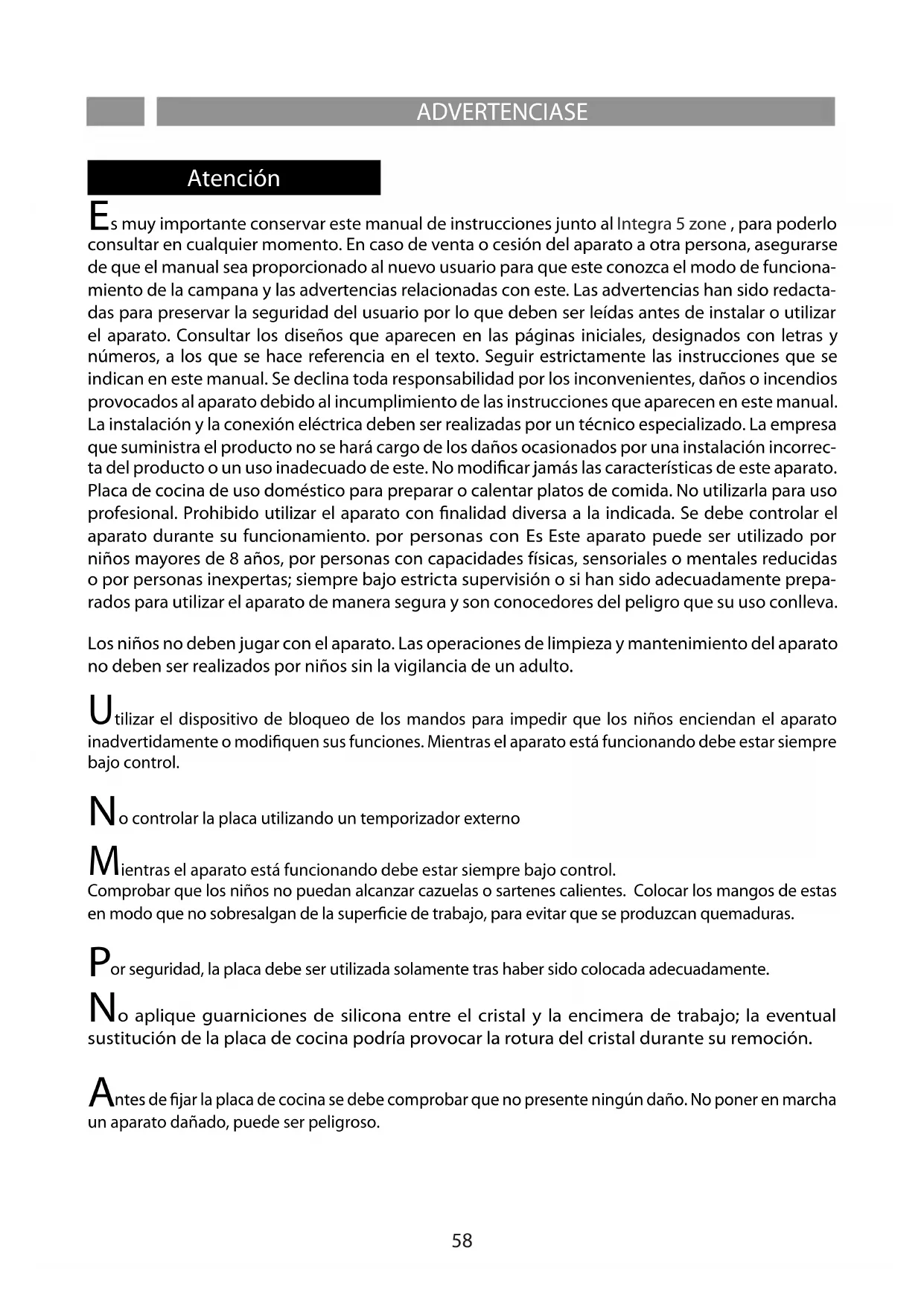 s muy importante conservar este manual de instrucciones junto al Integra 5 zone , para poderlo consultar en cualquier momento. En caso de venta o cesión del aparato a otra persona, asegurarse de que el manual sea proporcionado al nuevo usuario para que este conozca el modo de funciona- miento de la campana y las advertencias relacionadas con este. Las advertencias han sido redacta- das para preservar la seguridad del usuario por lo que deben ser leídas antes de instalar o utilizar el aparato. Consultar los diseños que aparecen en las páginas iniciales, designados con letras y números, a los que se hace referencia en el texto. Seguir estrictamente las instrucciones que se indican en este manual. Se declina toda responsabilidad por los inconvenientes, daños o incendios provocados al aparato debido al incumplimiento de las instrucciones que aparecen en este manual. La instalación y la conexión eléctrica deben ser realizadas por un técnico especializado. La empresa que suministra el producto no se hará cargo de los daños ocasionados por una instalación incorrec- ta del producto o un uso inadecuado de este. No modicar jamás las características de este aparato. Placa de cocina de uso doméstico para preparar o calentar platos de comida. No utilizarla para uso profesional. Prohibido utilizar el aparato con nalidad diversa a la indicada. Se debe controlar el aparato durante su funcionamiento. por personas con Es Este aparato puede ser utilizado por niños mayores de 8 años, por personas con capacidades físicas, sensoriales o mentales reducidas o por personas inexpertas; siempre bajo estricta supervisión o si han sido adecuadamente prepa- rados para utilizar el aparato de manera segura y son conocedores del peligro que su uso conlleva. Los niños no deben jugar con el aparato. Las operaciones de limpieza y mantenimiento del aparato no deben ser realizados por niños sin la vigilancia de un adulto.