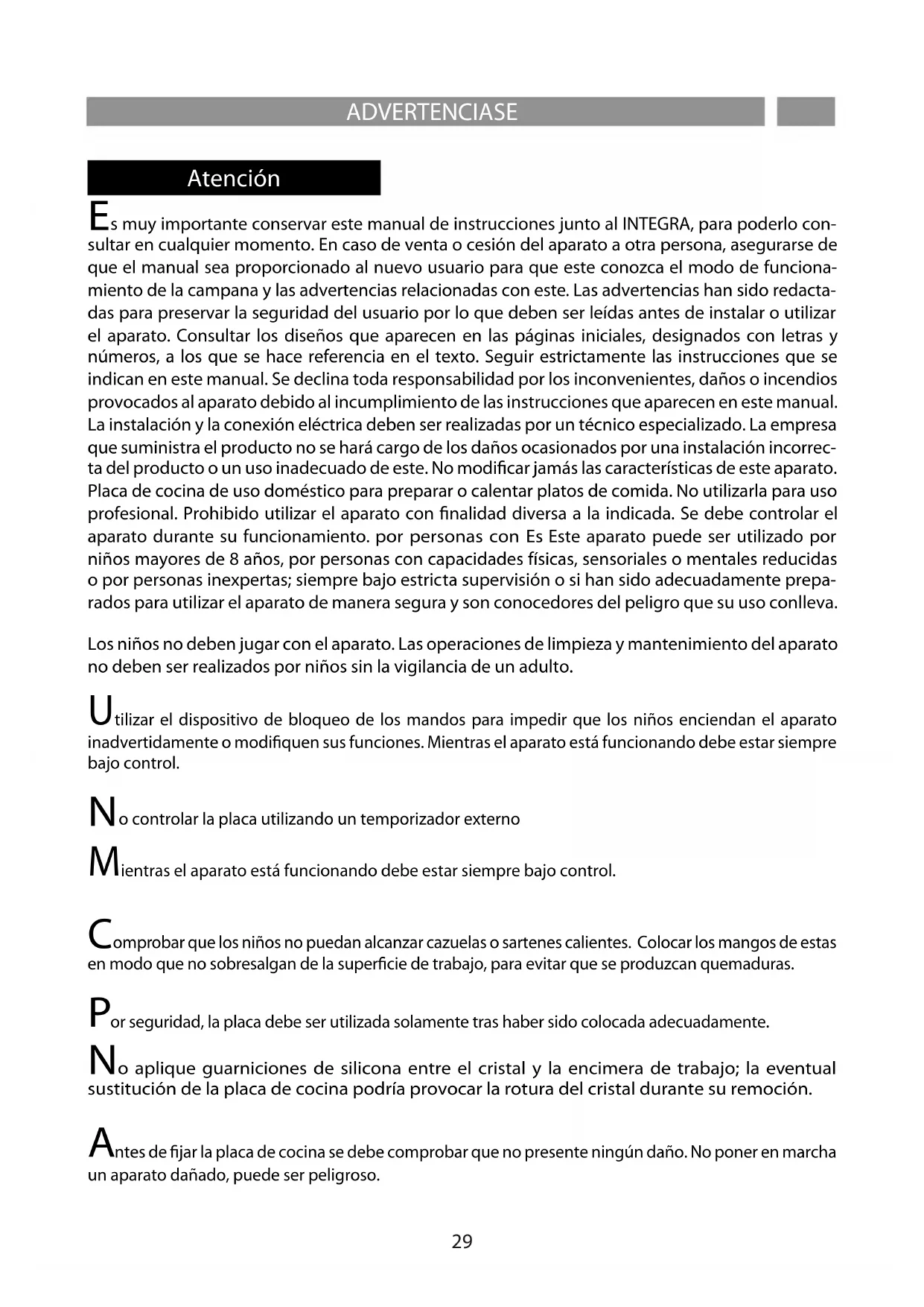 s muy importante conservar este manual de instrucciones junto al INTEGRA, para poderlo con- sultar en cualquier momento. En caso de venta o cesión del aparato a otra persona, asegurarse de que el manual sea proporcionado al nuevo usuario para que este conozca el modo de funciona- miento de la campana y las advertencias relacionadas con este. Las advertencias han sido redacta- das para preservar la seguridad del usuario por lo que deben ser leídas antes de instalar o utilizar el aparato. Consultar los diseños que aparecen en las páginas iniciales, designados con letras y números, a los que se hace referencia en el texto. Seguir estrictamente las instrucciones que se indican en este manual. Se declina toda responsabilidad por los inconvenientes, daños o incendios provocados al aparato debido al incumplimiento de las instrucciones que aparecen en este manual. La instalación y la conexión eléctrica deben ser realizadas por un técnico especializado. La empresa que suministra el producto no se hará cargo de los daños ocasionados por una instalación incorrec- ta del producto o un uso inadecuado de este. No modicar jamás las características de este aparato. Placa de cocina de uso doméstico para preparar o calentar platos de comida. No utilizarla para uso profesional. Prohibido utilizar el aparato con nalidad diversa a la indicada. Se debe controlar el aparato durante su funcionamiento. por personas con Es Este aparato puede ser utilizado por niños mayores de 8 años, por personas con capacidades físicas, sensoriales o mentales reducidas o por personas inexpertas; siempre bajo estricta supervisión o si han sido adecuadamente prepa- rados para utilizar el aparato de manera segura y son conocedores del peligro que su uso conlleva. Los niños no deben jugar con el aparato. Las operaciones de limpieza y mantenimiento del aparato no deben ser realizados por niños sin la vigilancia de un adulto.