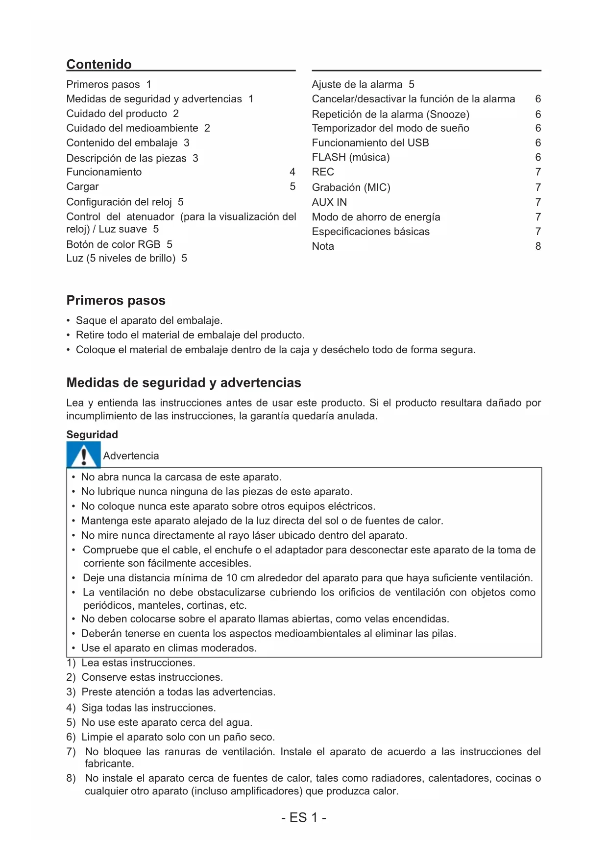 cualquier otro aparato (incluso amplicadores) que produzca calor. Primeros pasos 1 Medidas de seguridad y advertencias 1 Cuidado del producto 2 Cuidado del medioambiente 2 Contenido del embalaje 3 Descripción de las piezas 3 Funcionamiento 4 Cargar 5 Conguración del reloj 5 Control del atenuador (para la visualización del reloj) / Luz suave 5 Botón de color RGB 5 Luz (5 niveles de brillo) 5 Ajuste de la alarma 5 Cancelar/desactivar la función de la alarma: 6 Repetición de la alarma (Snooze) 6 Temporizador del modo de sueño 6 Funcionamiento del USB 6 FLASH (música) 6 REC: 7 Grabación (MIC) 7 AUX IN 7 Modo de ahorro de energía 7 Especicaciones básicas: 7 Nota: 8