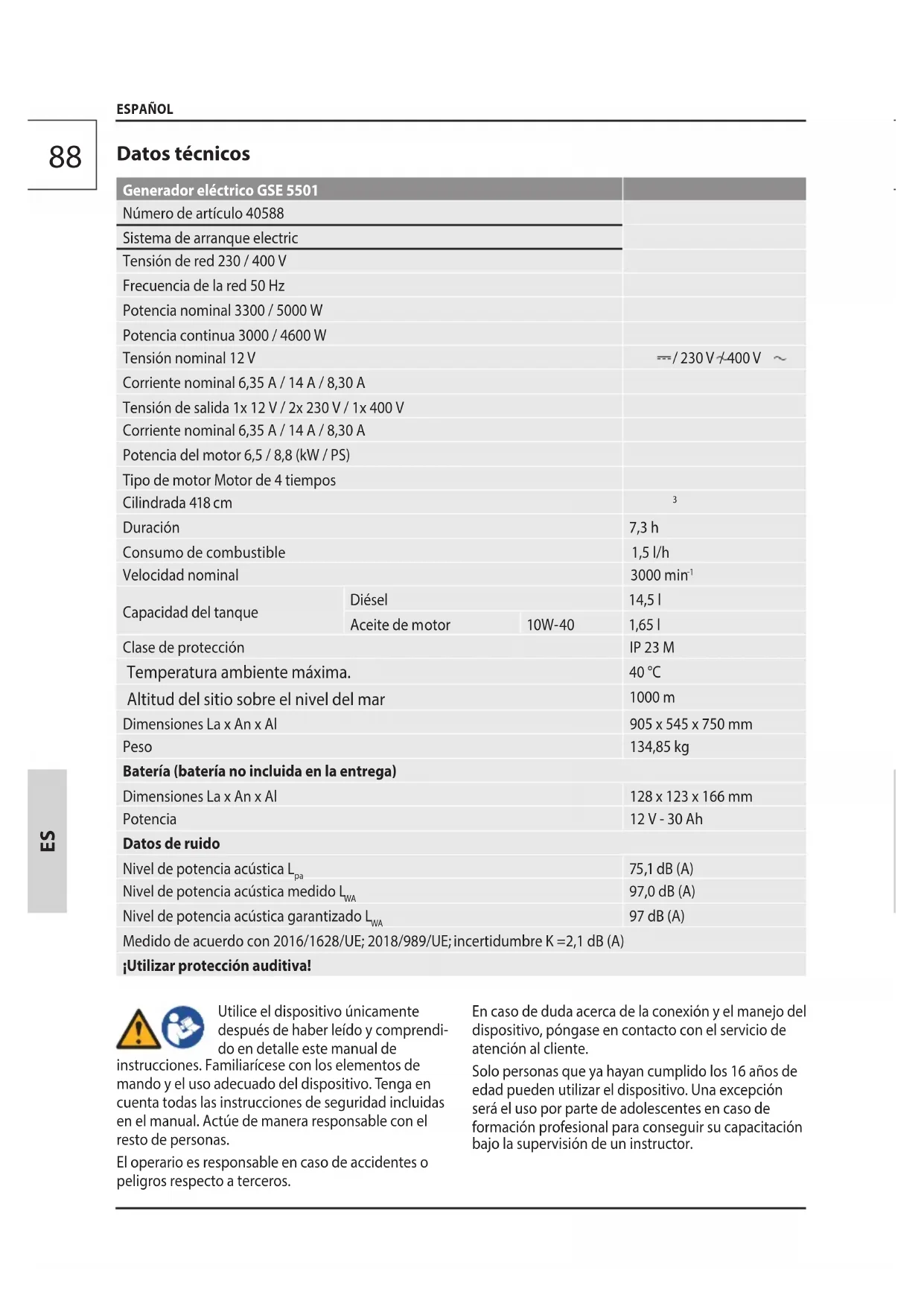 97 dB (A) Medido de acuerdo con 2016/1628/UE; 2018/989/UE; incertidumbre K =2,1 dB (A) ¡Utilizar protección auditiva! Utilice el dispositivo únicamente después de haber leído y comprendi- do en detalle este manual de instrucciones. Familiarícese con los elementos de mando y el uso adecuado del dispositivo. Tenga en cuenta todas las instrucciones de seguridad incluidas en el manual. Actúe de manera responsable con el resto de personas. El operario es responsable en caso de accidentes o peligros respecto a terceros. En caso de duda acerca de la conexión y el manejo del dispositivo, póngase en contacto con el servicio de atención al cliente. Solo personas que ya hayan cumplido los 16 años de edad pueden utilizar el dispositivo. Una excepción será el uso por parte de adolescentes en caso de formación profesional para conseguir su capacitación bajo la supervisión de un instructor.89 ESPAÑOL