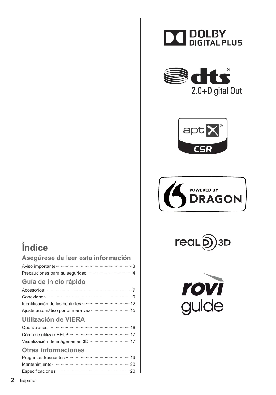 (MPEG2 y MPEG4-AVC(H.264)). Con respecto a la disponibilidad de servicios DVB-T / T2 en su área, consulte a su proveedor local. Con respecto a la disponibilidad de servicios DVB-C para este televisor, consulte a su proveedor de servicios de cable. Este televisor puede no funcionar correctamente con una señal que no cumpla con los estándares DVB-T / T2 o DVB-C. No todas las funciones estarán disponibles dependiendo del país, el área, el difusor, el proveedor del servicio y el entorno de red. No todos los módulos CI trabajan adecuadamente con este televisor. Consulte al proveedor del servicio en relación con el módulo CI disponible. Este televisor puede no funcionar correctamente con un módulo CI no aprobado por el proveedor del servicio. Dependiendo del proveedor del servicio es posible que haya que abonar tarifas adicionales. La compatibilidad con futuros servicios no está garantizada. Compruebe la información más reciente sobre los servicios disponibles en el sitio web siguiente. (Inglés solamente) http://panasonic.net/viera/support Panasonic no garantiza el funcionamiento ni el rendimiento de dispositivos periféricos de otros fabricantes, y rechazamos cualquier responsabilidad o daño que pueda surgir del funcionamiento y rendimiento utilizando dichos dispositivos periféricos de otro fabricante. Este producto cuenta con licencia del portafolio de patentes AVC para que un consumidor pueda hacer uso personal y no comercial para (i) codificar vídeo cumpliendo con la norma AVC (“AVC Video”) y/o (ii) decodificar AVC Video que fue codificado por un consumidor que desempeña una actividad personal y no comercial y/o que fue obtenido de un proveedor de vídeo con licencia para proveer AVC Video. No se otorga licencia ni se da a entender que ésta se otorga para ningún otro uso. Se puede obtener información adicional de MPEG LA, LLC. Visite http://www.mpegla.com.