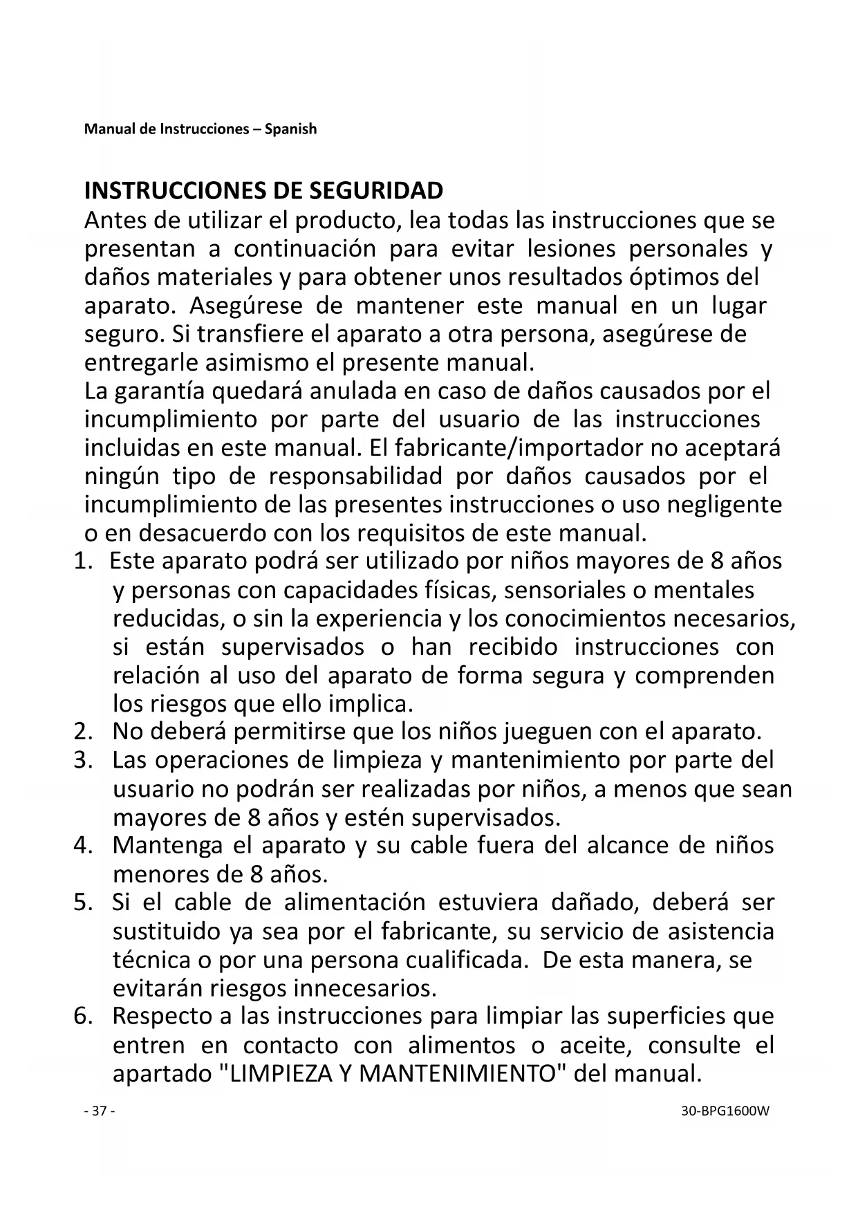 entren en contacto con alimentos o aceite, consulte el apartado "LIMPIEZA Y MANTENIMIENTO" del manual.- 38 - 30-BPG1600W