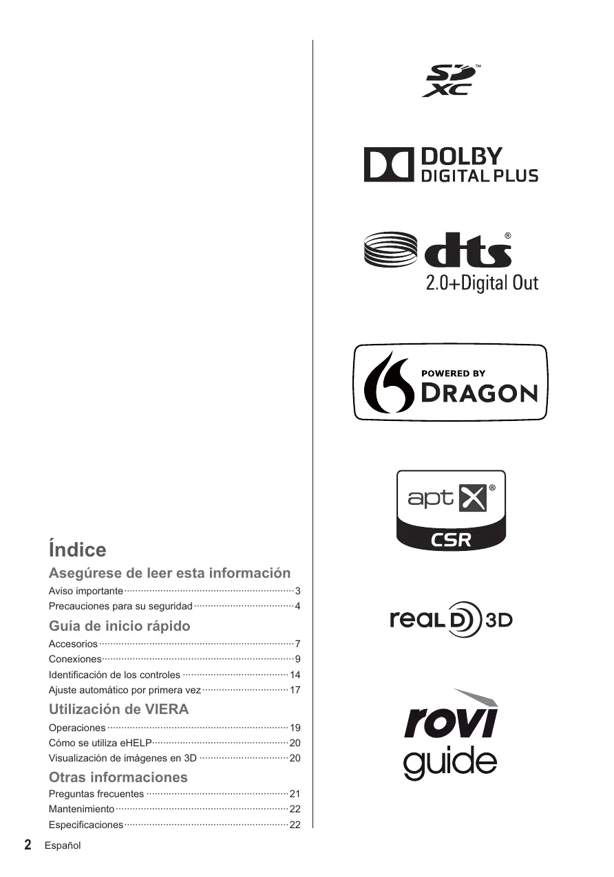 Español Aviso importante Aviso para las funciones DVB / emisión de datos / IPTV Para obtener información sobre las marcas registradas, consulte la [eHELP] (Soporte > Licencia). Este televisor está diseñado para cumplir con los estándares (a partir de agosto de 2013) de servicios digitales terrestres DVB-T / T2 (MPEG2 y MPEG4AVC(H.264)), servicios digitales de cable DVB-C (MPEG2 y MPEG4-AVC(H.264)) y servicios digitales de satélite DVB-S (MPEG2 y MPEG4-AVC(H.264)). Con respecto a la disponibilidad de servicios DVB-T / T2 y DVB-S en su área, consulte a su proveedor local. Con respecto a la disponibilidad de servicios DVB-C para este televisor, consulte a su proveedor de servicios de cable. Este televisor puede no funcionar correctamente con una señal que no cumpla las normas de DVB-T / T2, DVB-C o DVB-S. No todas las funciones estarán disponibles dependiendo del país, el área, el difusor, el proveedor del servicio, el satélite y el entorno de red. No todos los módulos CI trabajan adecuadamente con este televisor. Consulte al proveedor del servicio en relación con el módulo CI disponible. Este televisor puede no funcionar correctamente con un módulo CI no aprobado por el proveedor del servicio. Dependiendo del proveedor del servicio es posible que haya que abonar tarifas adicionales. La compatibilidad con futuros servicios no está garantizada. Compruebe la información más reciente sobre los servicios disponibles en el sitio web siguiente. (Inglés solamente) http://panasonic.net/viera/support Panasonic no garantiza el funcionamiento ni el rendimiento de dispositivos periféricos de otros fabricantes, y rechazamos cualquier responsabilidad o daño que pueda surgir del funcionamiento y rendimiento utilizando dichos dispositivos periféricos de otro fabricante. La grabación y la reproducción de contenidos en este o en cualquier otro dispositivo pueden requerir permiso del propietario de los derechos de autor u otro tipo de autorización. Panasonic no tiene autoridad ni puede garantizar dicho permiso y rechaza expresamente cualquier derecho, capacidad o intención de obtenerlo en nombre de usted. Usted es el responsable de asegurarse de que este o cualquier otro dispositivo se utilicen de acuerdo con la legislación nacional sobre los derechos de autor. Para obtener más información sobre las leyes y los reglamentos pertinentes, consulte la legislación nacional de su país o póngase en contacto con el propietario de los derechos de autor del contenido que desea grabar o reproducir. Español