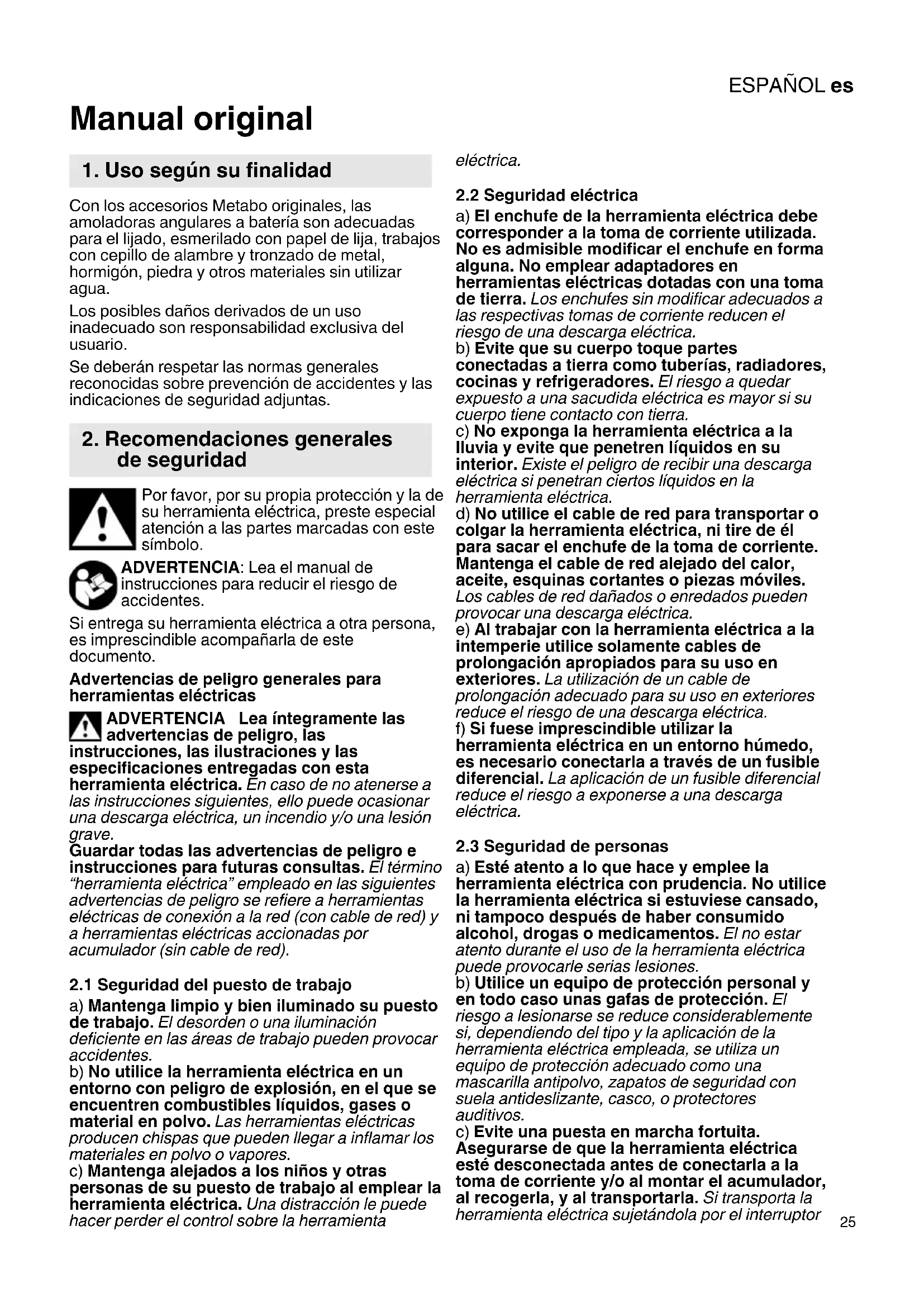 Manual original Con los accesorios Metabo originales, las amoladoras angulares a batería son adecuadas para el lijado, esmerilado con papel de lija, trabajos con cepillo de alambre y tronzado de metal, hormigón, piedra y otros materiales sin utilizar agua. Los posibles daños derivados de un uso inadecuado son responsabilidad exclusiva del usuario. Se deberán respetar las normas generales reconocidas sobre prevención de accidentes y las indicaciones de seguridad adjuntas. Por favor, por su propia protección y la de su herramienta eléctrica, preste especial atención a las partes marcadas con este símbolo. ADVERTENCIA: Lea el manual de instrucciones para reducir el riesgo de accidentes. Si entrega su herramienta eléctrica a otra persona, es imprescindible acompañarla de este documento. Advertencias de peligro generales para herramientas eléctricas ADVERTENCIA Lea íntegramente las advertencias de peligro, las instrucciones, las ilustraciones y las especificaciones entregadas con esta herramienta eléctrica. En caso de no atenerse a las instrucciones siguientes, ello puede ocasionar una descarga eléctrica, un incendio y/o una lesión grave. Guardar todas las advertencias de peligro e instrucciones para futuras consultas. El término “herramienta eléctrica” empleado en las siguientes advertencias de peligro se refiere a herramientas eléctricas de conexión a la red (con cable de red) y a herramientas eléctricas accionadas por acumulador (sin cable de red).