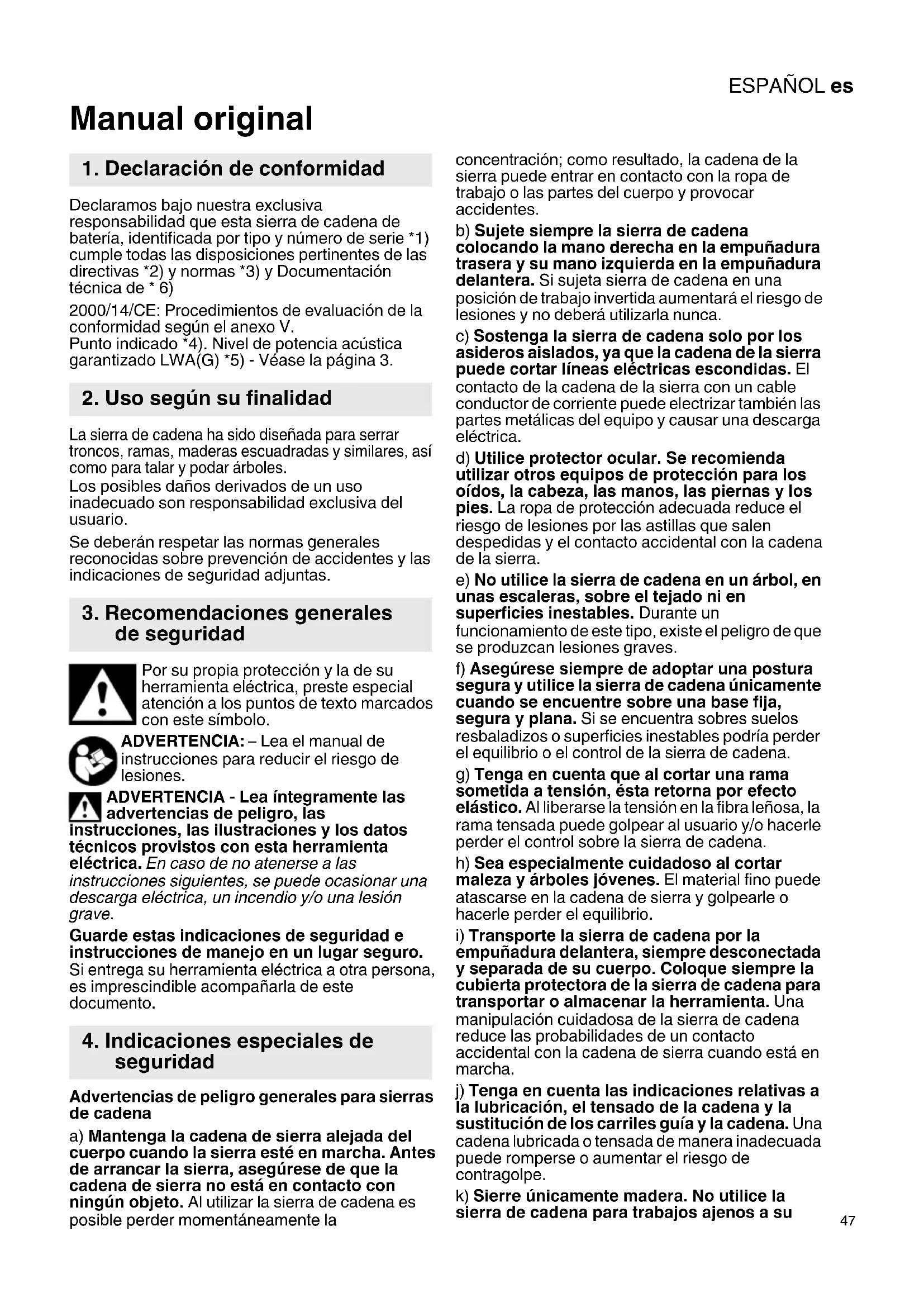 Manual original Declaramos bajo nuestra exclusiva responsabilidad que esta sierra de cadena de batería, identificada por tipo y número de serie *1) cumple todas las disposiciones pertinentes de las directivas *2) y normas *3) y Documentación técnica de * 6) 2000/14/CE: Procedimientos de evaluación de la conformidad según el anexo V. Punto indicado *4). Nivel de potencia acústica garantizado LWA(G) *5) - Véase la página 3. La sierra de cadena ha sido diseñada para serrar troncos, ramas, maderas escuadradas y similares, así como para talar y podar árboles. Los posibles daños derivados de un uso inadecuado son responsabilidad exclusiva del usuario. Se deberán respetar las normas generales reconocidas sobre prevención de accidentes y las indicaciones de seguridad adjuntas. Por su propia protección y la de su herramienta eléctrica, preste especial atención a los puntos de texto marcados con este símbolo. ADVERTENCIA: – Lea el manual de instrucciones para reducir el riesgo de lesiones. ADVERTENCIA - Lea íntegramente las advertencias de peligro, las instrucciones, las ilustraciones y los datos técnicos provistos con esta herramienta eléctrica. En caso de no atenerse a las instrucciones siguientes, se puede ocasionar una descarga eléctrica, un incendio y/o una lesión grave. Guarde estas indicaciones de seguridad e instrucciones de manejo en un lugar seguro. Si entrega su herramienta eléctrica a otra persona, es imprescindible acompañarla de este documento. Advertencias de peligro generales para sierras de cadena a) Mantenga la cadena de sierra alejada del cuerpo cuando la sierra esté en marcha. Antes de arrancar la sierra, asegúrese de que la cadena de sierra no está en contacto con ningún objeto. Al utilizar la sierra de cadena es posible perder momentáneamente la concentración; como resultado, la cadena de la sierra puede entrar en contacto con la ropa de trabajo o las partes del cuerpo y provocar accidentes. b) Sujete siempre la sierra de cadena colocando la mano derecha en la empuñadura trasera y su mano izquierda en la empuñadura delantera. Si sujeta sierra de cadena en una posición de trabajo invertida aumentará el riesgo de lesiones y no deberá utilizarla nunca. c) Sostenga la sierra de cadena solo por los asideros aislados, ya que la cadena de la sierra puede cortar líneas eléctricas escondidas. El contacto de la cadena de la sierra con un cable conductor de corriente puede electrizar también las partes metálicas del equipo y causar una descarga eléctrica. d) Utilice protector ocular. Se recomienda utilizar otros equipos de protección para los oídos, la cabeza, las manos, las piernas y los pies. La ropa de protección adecuada reduce el riesgo de lesiones por las astillas que salen despedidas y el contacto accidental con la cadena de la sierra. e) No utilice la sierra de cadena en un árbol, en unas escaleras, sobre el tejado ni en superficies inestables. Durante un funcionamiento de este tipo, existe el peligro de que se produzcan lesiones graves. f) Asegúrese siempre de adoptar una postura segura y utilice la sierra de cadena únicamente cuando se encuentre sobre una base fija, segura y plana. Si se encuentra sobres suelos resbaladizos o superficies inestables podría perder el equilibrio o el control de la sierra de cadena. g) Tenga en cuenta que al cortar una rama sometida a tensión, ésta retorna por efecto elástico. Al liberarse la tensión en la fibra leñosa, la rama tensada puede golpear al usuario y/o hacerle perder el control sobre la sierra de cadena. h) Sea especialmente cuidadoso al cortar maleza y árboles jóvenes. El material fino puede atascarse en la cadena de sierra y golpearle o hacerle perder el equilibrio.