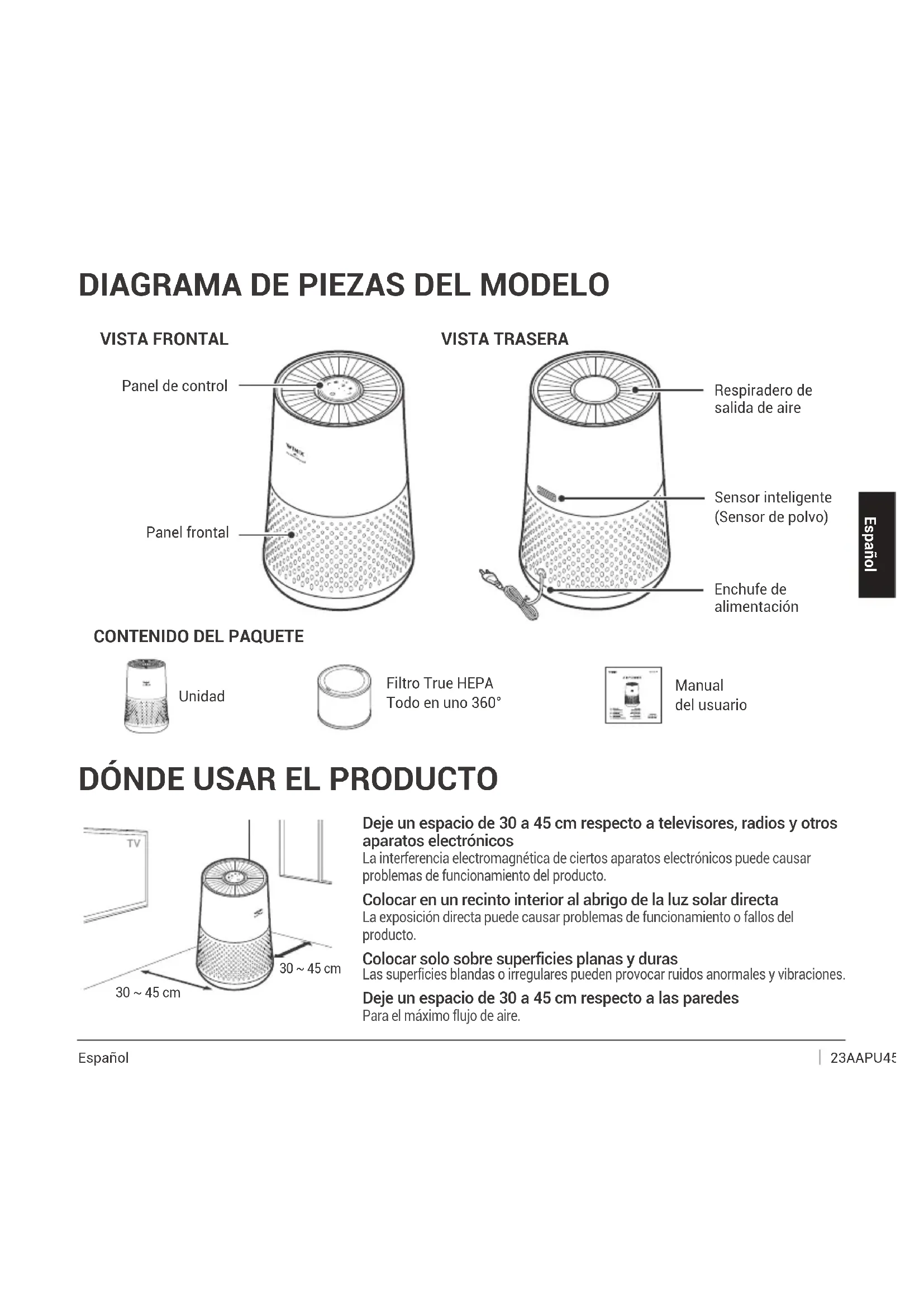 Panel de control Respiradero de salida de aire Panel frontal Sensor inteligente (Sensor de polvo) Enchufe de alimentación VISTA TRASERA Unidad Filtro True HEPA Todo en uno 360° Manual del usuario 30~45cm30~45cm EspañolEspañol Español