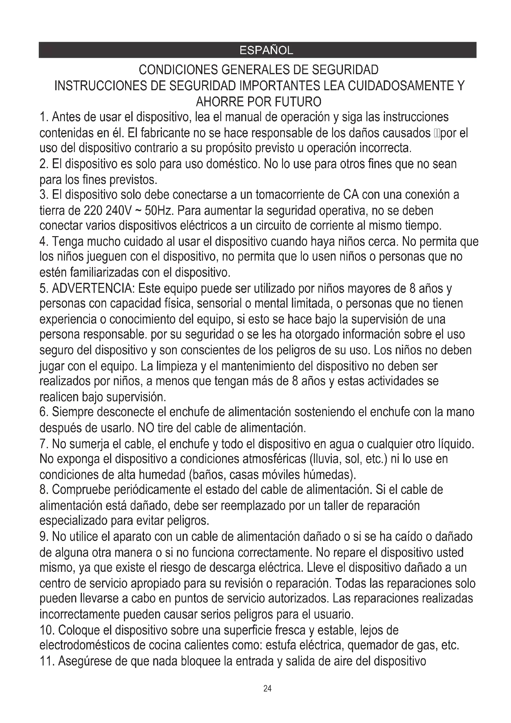 tierra de 220 240V ~ 50Hz. Para aumentar la seguridad operativa, no se deben conectar varios dispositivos eléctricos a un circuito de corriente al mismo tiempo.