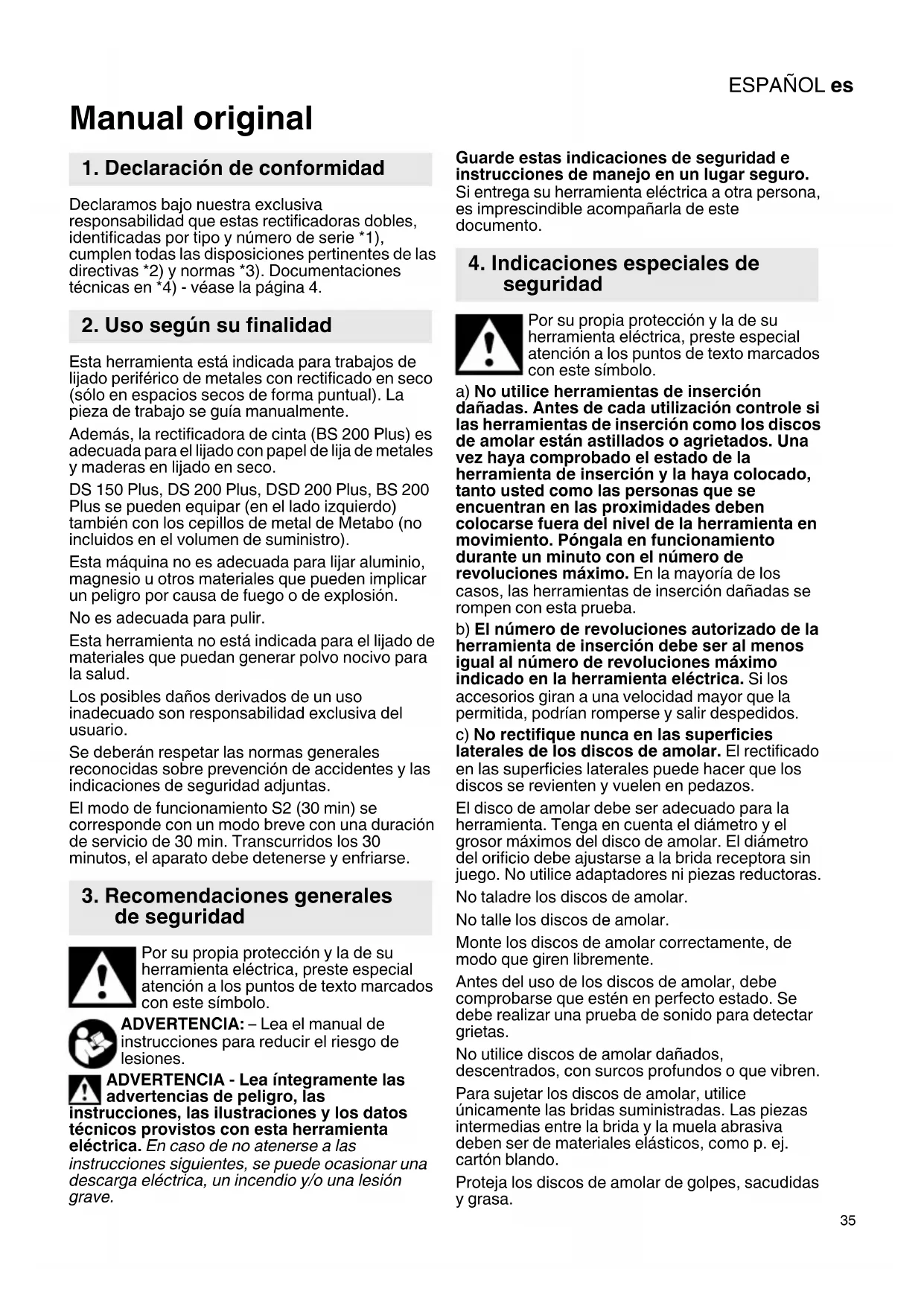 Manual original Declaramos bajo nuestra exclusiva responsabilidad que estas rectificadoras dobles, identificadas por tipo y número de serie *1), cumplen todas las disposiciones pertinentes de las directivas *2) y normas *3). Documentaciones técnicas en *4) - véase la página 4. Esta herramienta está indicada para trabajos de lijado periférico de metales con rectificado en seco (sólo en espacios secos de forma puntual). La pieza de trabajo se guía manualmente. Además, la rectificadora de cinta (BS 200 Plus) es adecuada para el lijado con papel de lija de metales y maderas en lijado en seco. DS 150 Plus, DS 200 Plus, DSD 200 Plus, BS 200 Plus se pueden equipar (en el lado izquierdo) también con los cepillos de metal de Metabo (no incluidos en el volumen de suministro). Esta máquina no es adecuada para lijar aluminio, magnesio u otros materiales que pueden implicar un peligro por causa de fuego o de explosión. No es adecuada para pulir. Esta herramienta no está indicada para el lijado de materiales que puedan generar polvo nocivo para la salud. Los posibles daños derivados de un uso inadecuado son responsabilidad exclusiva del usuario. Se deberán respetar las normas generales reconocidas sobre prevención de accidentes y las indicaciones de seguridad adjuntas. El modo de funcionamiento S2 (30 min) se corresponde con un modo breve con una duración de servicio de 30 min. Transcurridos los 30 minutos, el aparato debe detenerse y enfriarse. Por su propia protección y la de su herramienta eléctrica, preste especial atención a los puntos de texto marcados con este símbolo. ADVERTENCIA: – Lea el manual de instrucciones para reducir el riesgo de lesiones. ADVERTENCIA - Lea íntegramente las advertencias de peligro, las instrucciones, las ilustraciones y los datos técnicos provistos con esta herramienta eléctrica. En caso de no atenerse a las instrucciones siguientes, se puede ocasionar una descarga eléctrica, un incendio y/o una lesión grave. Guarde estas indicaciones de seguridad e instrucciones de manejo en un lugar seguro. Si entrega su herramienta eléctrica a otra persona, es imprescindible acompañarla de este documento. Por su propia protección y la de su herramienta eléctrica, preste especial atención a los puntos de texto marcados con este símbolo. a) No utilice herramientas de inserción dañadas. Antes de cada utilización controle si las herramientas de inserción como los discos de amolar están astillados o agrietados. Una vez haya comprobado el estado de la herramienta de inserción y la haya colocado, tanto usted como las personas que se encuentran en las proximidades deben colocarse fuera del nivel de la herramienta en movimiento. Póngala en funcionamiento durante un minuto con el número de revoluciones máximo. En la mayoría de los casos, las herramientas de inserción dañadas se rompen con esta prueba. b) El número de revoluciones autorizado de la herramienta de inserción debe ser al menos igual al número de revoluciones máximo indicado en la herramienta eléctrica. Si los accesorios giran a una velocidad mayor que la permitida, podrían romperse y salir despedidos. c) No rectifique nunca en las superficies laterales de los discos de amolar. El rectificado en las superficies laterales puede hacer que los discos se revienten y vuelen en pedazos. El disco de amolar debe ser adecuado para la herramienta. Tenga en cuenta el diámetro y el grosor máximos del disco de amolar. El diámetro del orificio debe ajustarse a la brida receptora sin juego. No utilice adaptadores ni piezas reductoras. No taladre los discos de amolar. No talle los discos de amolar. Monte los discos de amolar correctamente, de modo que giren libremente. Antes del uso de los discos de amolar, debe comprobarse que estén en perfecto estado. Se debe realizar una prueba de sonido para detectar grietas. No utilice discos de amolar dañados, descentrados, con surcos profundos o que vibren. Para sujetar los discos de amolar, utilice únicamente las bridas suministradas. Las piezas intermedias entre la brida y la muela abrasiva deben ser de materiales elásticos, como p. ej. cartón blando. Proteja los discos de amolar de golpes, sacudidas y grasa.