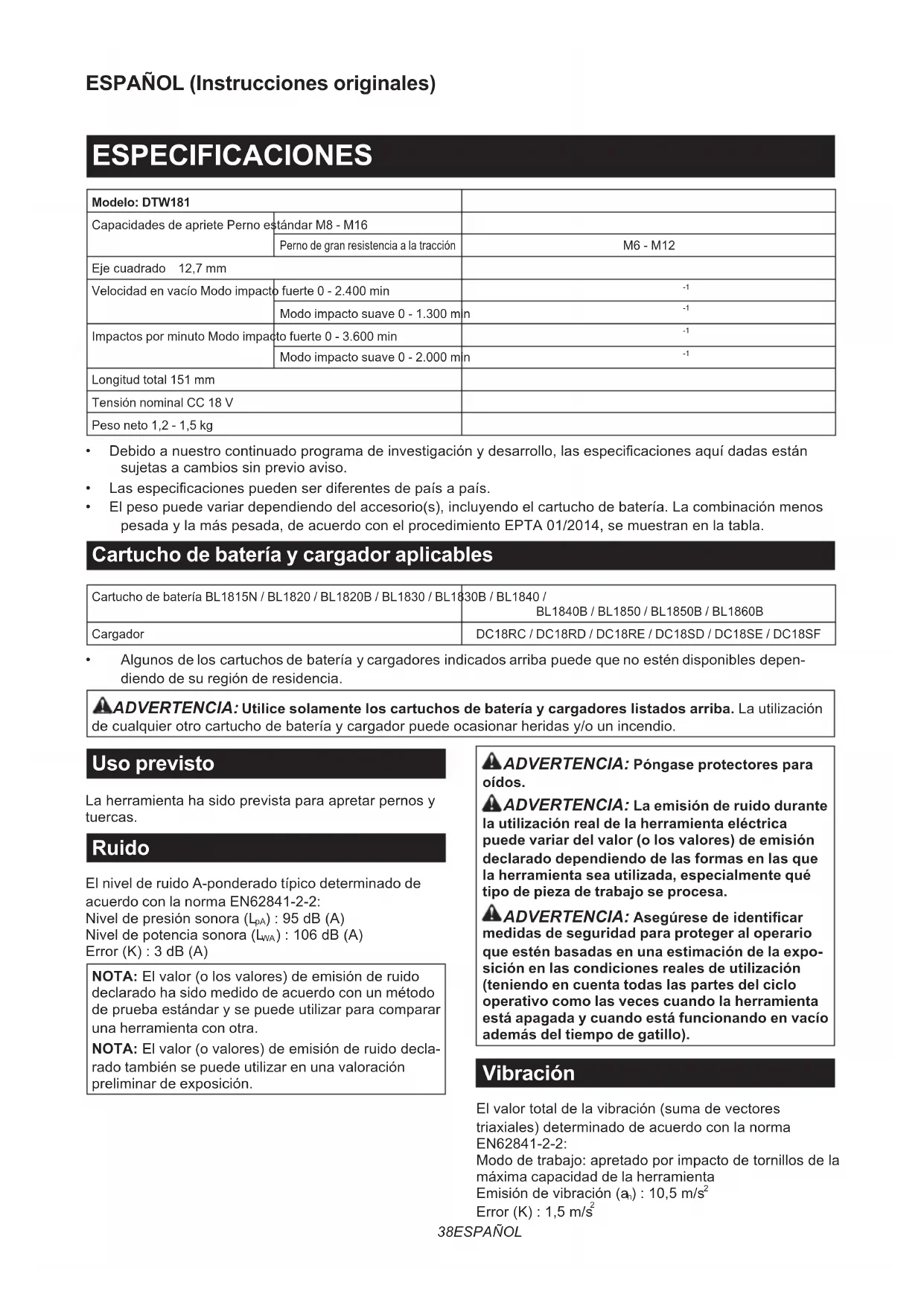 - Algunosdeloscartuchosdebateríaycargadoresindicadosarribapuedequenoesténdisponiblesdepen- diendo de su región de residencia. ADVERTENCIA: Utilice solamente los cartuchos de batería y cargadores listados arriba. La utilización decualquierotrocartuchodebateríaycargadorpuedeocasionarheridasy/ounincendio. Uso previsto Laherramientahasidoprevistaparaapretarpernosy tuercas. Ruido El nivel de ruido A-ponderado típico determinado de acuerdo con la norma EN62841-2-2: Niveldepresiónsonora(L