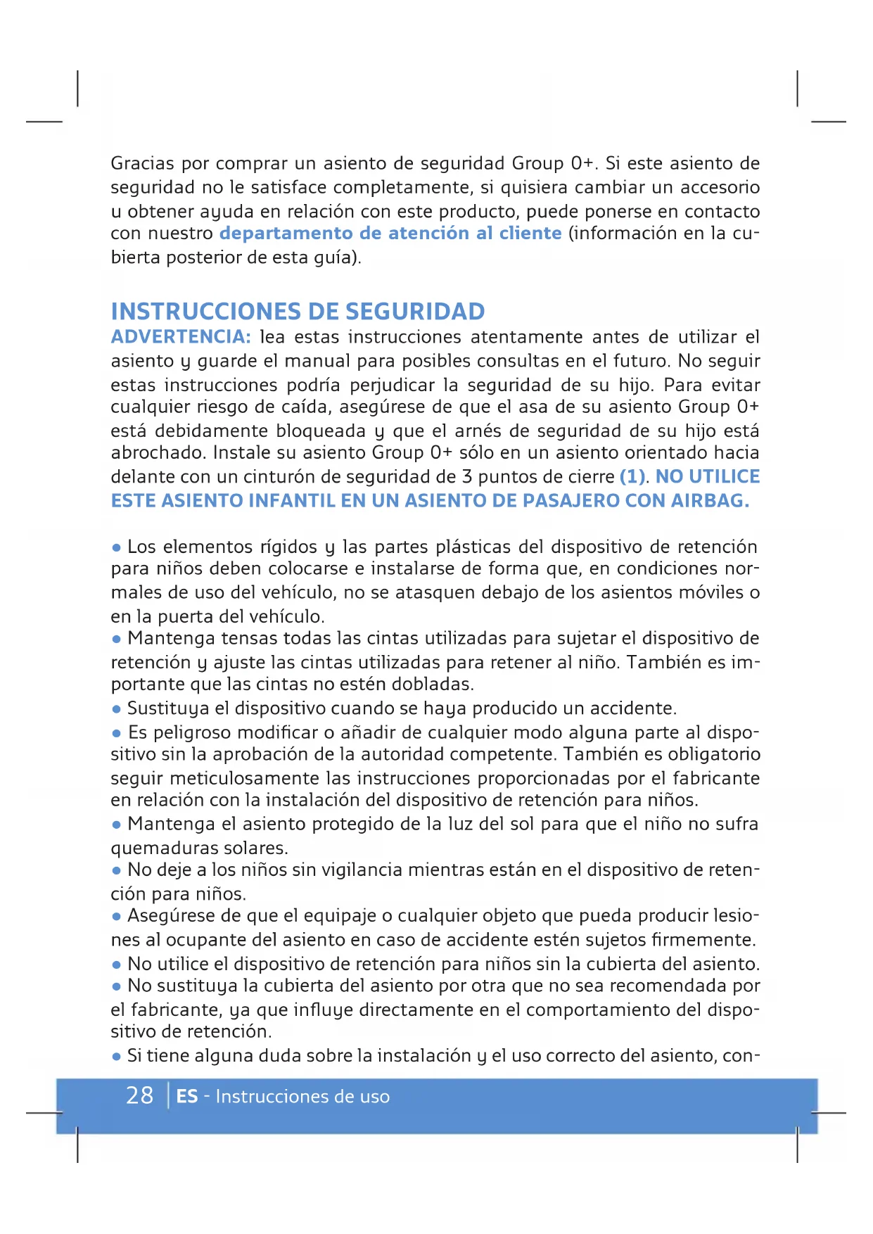- In caso di dubbio contattare il produttore del dispositivo di retenuta op- pure il rivenditore.28 ES - Instrucciones de uso Gracias por comprar un asiento de seguridad Group 0+. Si este asiento de seguridad no le satisface completamente, si quisiera cambiar un accesorio u obtener ayuda en relación con este producto, puede ponerse en contacto con nuestro departamento de atención al cliente (información en la cu- bierta posterior de esta guía).
