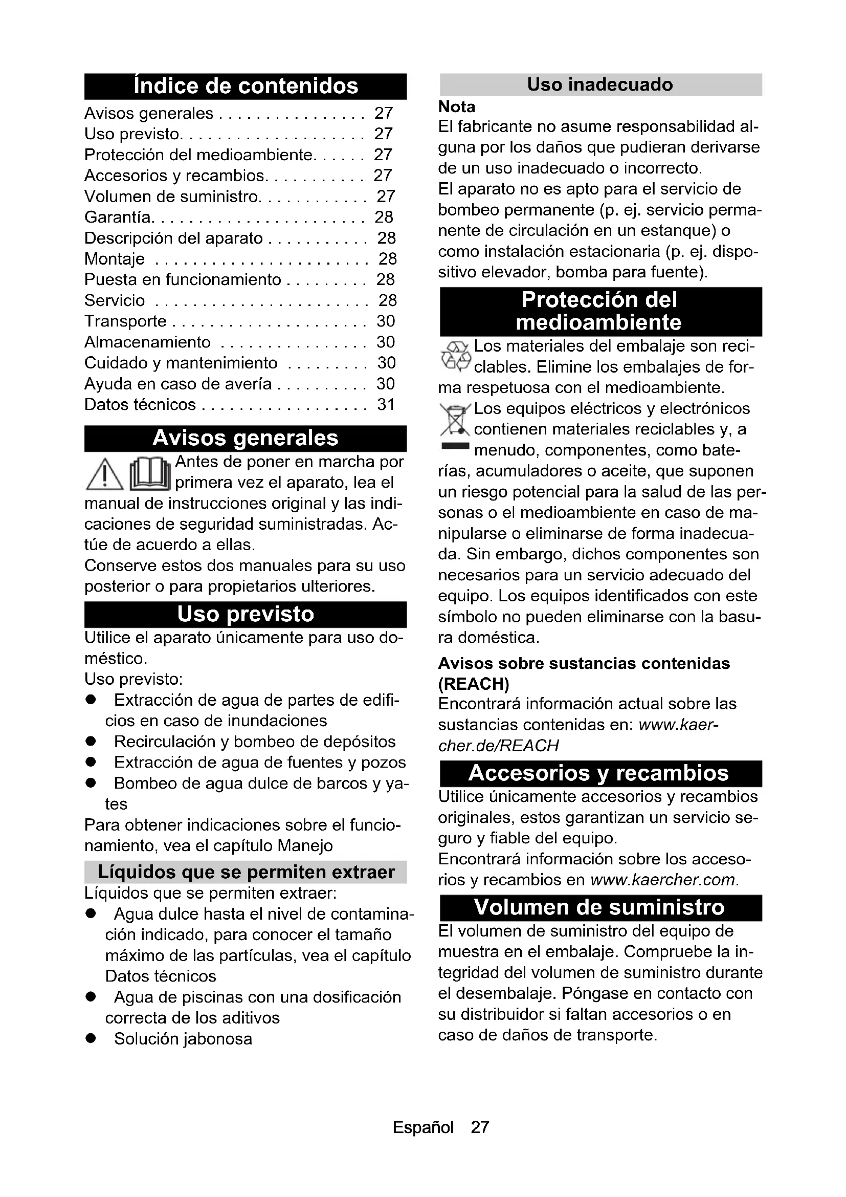 - Uitschakelhoogte vlotter- schakelaar (vergrendeling onderste positie) mm 40-120 Handmatig gebruik Minimale vloeistofhoogte vuil- en schoonwatertrans- port mm 60 Hoogte restvloeistof vuil- en schoonwatertransport mm 25 Minimale vloeistofhoogte vlakke afzuiging mm 40 Hoogte restvloeistof vlak- ke afzuiging mm 1 Afmetingen en gewichten Gewicht (zonder toebeho- ren) kg 4,8 Netkabel Kabellengte m 10Español 27 Índice de contenidos Avisos generales Antes de poner en marcha por primera vez el aparato, lea el manual de instrucciones original y las indi- caciones de seguridad suministradas. Ac- túe de acuerdo a ellas. Conserve estos dos manuales para su uso posterior o para propietarios ulteriores. Uso previsto Utilice el aparato únicamente para uso do- méstico. Uso previsto: Extracción de agua de partes de edifi- cios en caso de inundaciones Recirculación y bombeo de depósitos Extracción de agua de fuentes y pozos Bombeo de agua dulce de barcos y ya- tes Para obtener indicaciones sobre el funcio- namiento, vea el capítulo Manejo Líquidos que se permiten extraer Líquidos que se permiten extraer: Agua dulce hasta el nivel de contamina- ción indicado, para conocer el tamaño máximo de las partículas, vea el capítulo Datos técnicos Agua de piscinas con una dosificación correcta de los aditivos Solución jabonosa Uso inadecuado Nota El fabricante no asume responsabilidad al- guna por los daños que pudieran derivarse de un uso inadecuado o incorrecto. El aparato no es apto para el servicio de bombeo permanente (p. ej. servicio perma- nente de circulación en un estanque) o como instalación estacionaria (p. ej. dispo- sitivo elevador, bomba para fuente). Protección del medioambiente Los materiales del embalaje son reci- clables. Elimine los embalajes de for- ma respetuosa con el medioambiente. Los equipos eléctricos y electrónicos contienen materiales reciclables y, a menudo, componentes, como bate- rías, acumuladores o aceite, que suponen un riesgo potencial para la salud de las per- sonas o el medioambiente en caso de ma- nipularse o eliminarse de forma inadecua- da. Sin embargo, dichos componentes son necesarios para un servicio adecuado del equipo. Los equipos identificados con este símbolo no pueden eliminarse con la basu- ra doméstica. Avisos sobre sustancias contenidas (REACH) Encontrará información actual sobre las sustancias contenidas en: www.kaer- cher.de/REACH Accesorios y recambios Utilice únicamente accesorios y recambios originales, estos garantizan un servicio se- guro y fiable del equipo. Encontrará información sobre los acceso- rios y recambios en www.kaercher.com. Volumen de suministro El volumen de suministro del equipo de muestra en el embalaje. Compruebe la in- tegridad del volumen de suministro durante el desembalaje. Póngase en contacto con su distribuidor si faltan accesorios o en caso de daños de transporte. Avisos generales p. 27