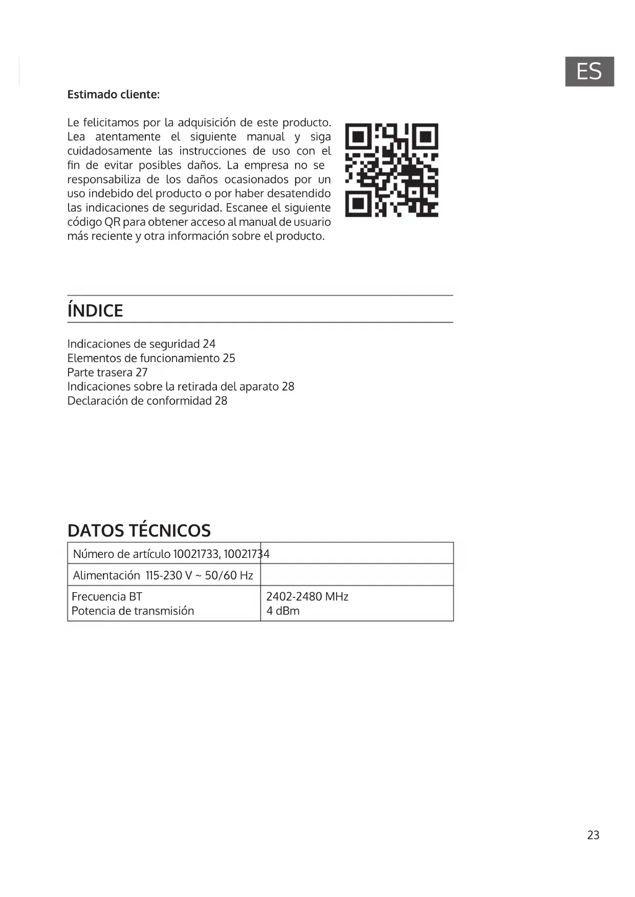 Indicaciones de seguridad 24 Elementos de funcionamiento 25 Parte trasera 27 Indicaciones sobre la retirada del aparato 28 Declaración de conformidad 28 Estimado cliente: Le felicitamos por la adquisición de este producto. Lea atentamente el siguiente manual y siga cuidadosamente las instrucciones de uso con el n de evitar posibles daños. La empresa no se responsabiliza de los daños ocasionados por un uso indebido del producto o por haber desatendido las indicaciones de seguridad. Escanee el siguiente código QR para obtener acceso al manual de usuario más reciente y otra información sobre el producto.