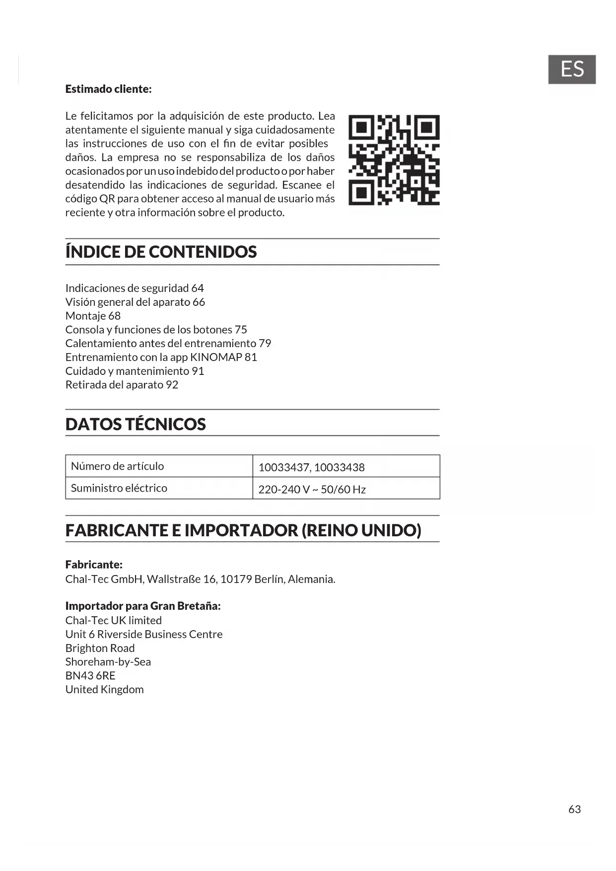 Indicaciones de seguridad 64 Visión general del aparato 66 Montaje 68 Consola y funciones de los botones 75 Calentamiento antes del entrenamiento 79 Entrenamiento con la app KINOMAP 81 Cuidado y mantenimiento 91 Retirada del aparato 92