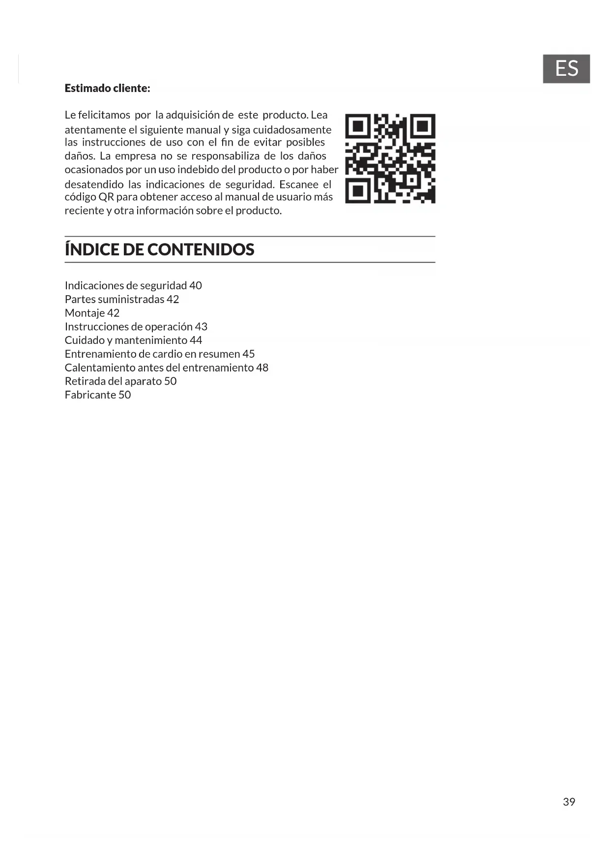 Indicaciones de seguridad 40 Partes suministradas 42 Montaje 42 Instrucciones de operación 43 Cuidado y mantenimiento 44 Entrenamiento de cardio en resumen 45 Calentamiento antes del entrenamiento 48 Retirada del aparato 50 Fabricante 5040