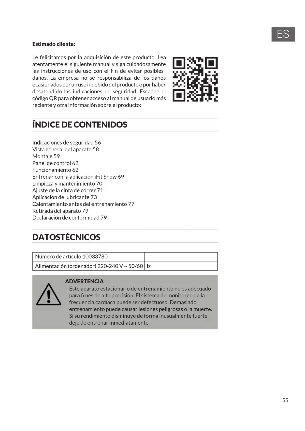 Indicaciones de seguridad 56 Vista general del aparato 58 Montaje 59 Panel de control 62 Funcionamiento 62 Entrenar con la aplicación iFit Show 69 Limpieza y mantenimiento 70 Ajuste de la cinta de correr 71 Aplicación de lubricante 73 Calentamiento antes del entrenamiento 77 Retirada del aparato 79 Declaración de conformidad 79