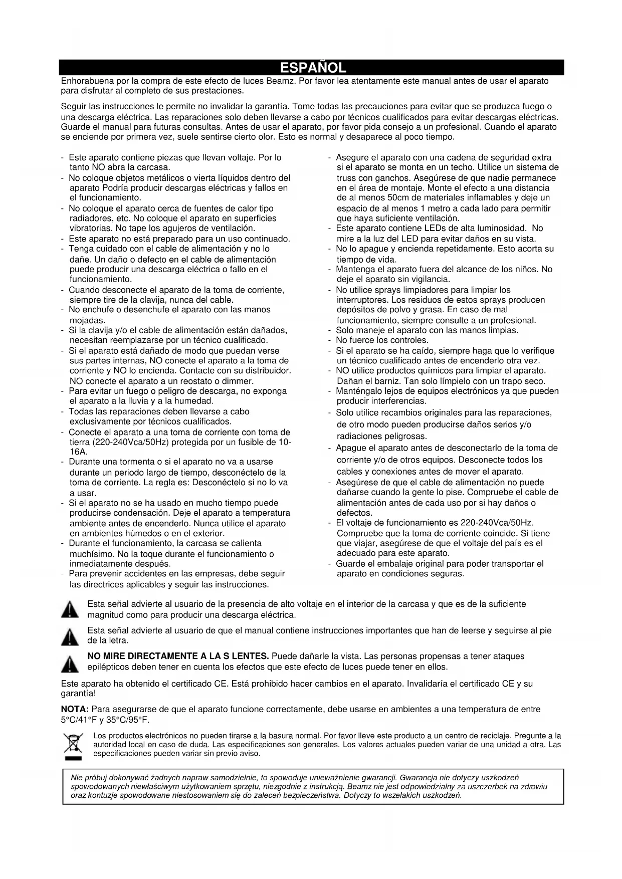 Reinigen Sie die Nebelmaschine in einem gut belüfteten Raum!ESPAÑOL Enhorabuena por la compra de este efecto de luces Beamz. Por favor lea atentamente este manual antes de usar el aparato para disfrutar al completo de sus prestaciones. Seguir las instrucciones le permite no invalidar la garantía. Tome todas las precauciones para evitar que se produzca fuego o una descarga eléctrica. Las reparaciones solo deben llevarse a cabo por técnicos cualificados para evitar descargas eléctricas. Guarde el manual para futuras consultas. Antes de usar el aparato, por favor pida consejo a un profesional. Cuando el aparato se enciende por primera vez, suele sentirse cierto olor. Esto es normal y desaparece al poco tiempo. - Este aparato contiene piezas que llevan voltaje. Por lo tanto NO abra la carcasa. - No coloque objetos metálicos o vierta líquidos dentro del aparato Podría producir descargas eléctricas y fallos en el funcionamiento. - No coloque el aparato cerca de fuentes de calor tipo radiadores, etc. No coloque el aparato en superficies vibratorias. No tape los agujeros de ventilación. - Este aparato no está preparado para un uso continuado. - Tenga cuidado con el cable de alimentación y no lo dañe. Un daño o defecto en el cable de alimentación puede producir una descarga eléctrica o fallo en el funcionamiento. - Cuando desconecte el aparato de la toma de corriente, siempre tire de la clavija, nunca del cable. - No enchufe o desenchufe el aparato con las manos mojadas. - Si la clavija y/o el cable de alimentación están dañados, necesitan reemplazarse por un técnico cualificado. - Si el aparato está dañado de modo que puedan verse sus partes internas, NO conecte el aparato a la toma de corriente y NO lo encienda. Contacte con su distribuidor. NO conecte el aparato a un reostato o dimmer. - Para evitar un fuego o peligro de descarga, no exponga el aparato a la lluvia y a la humedad. - Todas las reparaciones deben llevarse a cabo exclusivamente por técnicos cualificados. - Conecte el aparato a una toma de corriente con toma de tierra (220-240Vca/50Hz) protegida por un fusible de 10- 16A. - Durante una tormenta o si el aparato no va a usarse durante un periodo largo de tiempo, desconéctelo de la toma de corriente. La regla es: Desconéctelo si no lo va a usar. - Si el aparato no se ha usado en mucho tiempo puede producirse condensación. Deje el aparato a temperatura ambiente antes de encenderlo. Nunca utilice el aparato en ambientes húmedos o en el exterior. - Durante el funcionamiento, la carcasa se calienta muchísimo. No la toque durante el funcionamiento o inmediatamente después. - Para prevenir accidentes en las empresas, debe seguir las directrices aplicables y seguir las instrucciones. - Asegure el aparato con una cadena de seguridad extra si el aparato se monta en un techo. Utilice un sistema de truss con ganchos. Asegúrese de que nadie permanece en el área de montaje. Monte el efecto a una distancia de al menos 50cm de materiales inflamables y deje un espacio de al menos 1 metro a cada lado para permitir que haya suficiente ventilación. - Este aparato contiene LEDs de alta luminosidad. No mire a la luz del LED para evitar daños en su vista. - No lo apague y encienda repetidamente. Esto acorta su tiempo de vida. - Mantenga el aparato fuera del alcance de los niños. No deje el aparato sin vigilancia. - No utilice sprays limpiadores para limpiar los interruptores. Los residuos de estos sprays producen depósitos de polvo y grasa. En caso de mal funcionamiento, siempre consulte a un profesional. - Solo maneje el aparato con las manos limpias. - No fuerce los controles. - Si el aparato se ha caído, siempre haga que lo verifique un técnico cualificado antes de encenderlo otra vez. - NO utilice productos químicos para limpiar el aparato. Dañan el barniz. Tan solo límpielo con un trapo seco. - Manténgalo lejos de equipos electrónicos ya que pueden producir interferencias. - Solo utilice recambios originales para las reparaciones, de otro modo pueden producirse daños serios y/o radiaciones peligrosas. - Apague el aparato antes de desconectarlo de la toma de corriente y/o de otros equipos. Desconecte todos los cables y conexiones antes de mover el aparato. - Asegúrese de que el cable de alimentación no puede dañarse cuando la gente lo pise. Compruebe el cable de alimentación antes de cada uso por si hay daños o defectos. - El voltaje de funcionamiento es 220-240Vca/50Hz. Compruebe que la toma de corriente coincide. Si tiene que viajar, asegúrese de que el voltaje del país es el adecuado para este aparato. - Guarde el embalaje original para poder transportar el aparato en condiciones seguras. Esta señal advierte al usuario de la presencia de alto voltaje en el interior de la carcasa y que es de la suficiente magnitud como para producir una descarga eléctrica. Esta señal advierte al usuario de que el manual contiene instrucciones importantes que han de leerse y seguirse al pie de la letra. NO MIRE DIRECTAMENTE A LA S LENTES. Puede dañarle la vista. Las personas propensas a tener ataques epilépticos deben tener en cuenta los efectos que este efecto de luces puede tener en ellos. Este aparato ha obtenido el certificado CE. Está prohibido hacer cambios en el aparato. Invalidaría el certificado CE y su garantía! NOTA: Para asegurarse de que el aparato funcione correctamente, debe usarse en ambientes a una temperatura de entre 5°C/41°F y 35°C/95°F. Los productos electrónicos no pueden tirarse a la basura normal. Por favor lleve este producto a un centro de reciclaje. Pregunte a la autoridad local en caso de duda. Las especificaciones son generales. Los valores actuales pueden variar de una unidad a otra. Las especificaciones pueden variar sin previo aviso. Nie próbuj dokonywać żadnych napraw samodzielnie, to spowoduje unieważnienie gwarancji. Gwarancja nie dotyczy uszkodzeń spowodowanych niewłaściwym użytkowaniem sprzętu, niezgodnie z in