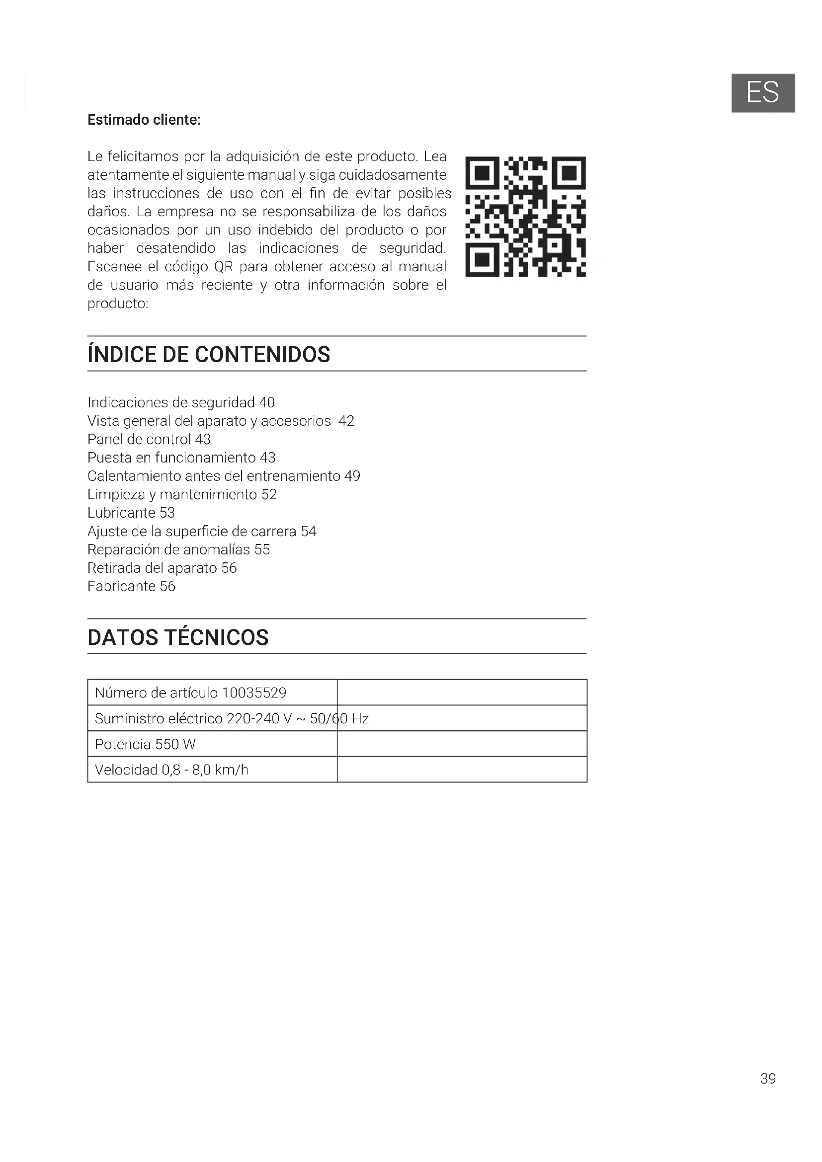 Número de artículo 10035529 Suministro eléctrico 220-240 V ~ 50/60 Hz Potencia 550 W Velocidad 0,8 - 8,0 km/h40