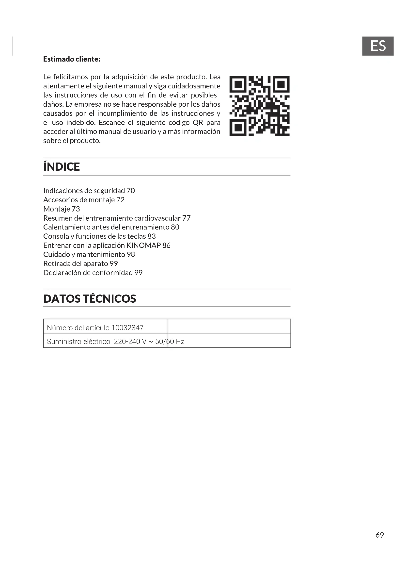 Estimado cliente: Le felicitamos por la adquisición de este producto. Lea atentamente el siguiente manual y siga cuidadosamente las instrucciones de uso con el n de evitar posibles daños. La empresa no se hace responsable por los daños causados por el incumplimiento de las instrucciones y el uso indebido. Escanee el siguiente código QR para acceder al último manual de usuario y a más información sobre el producto. ÍNDICE Indicaciones de seguridad 70 Accesorios de montaje 72 Montaje 73 Resumen del entrenamiento cardiovascular 77 Calentamiento antes del entrenamiento 80 Consola y funciones de las teclas 83 Entrenar con la aplicación KINOMAP 86 Cuidado y mantenimiento 98 Retirada del aparato 99 Declaración de conformidad 99