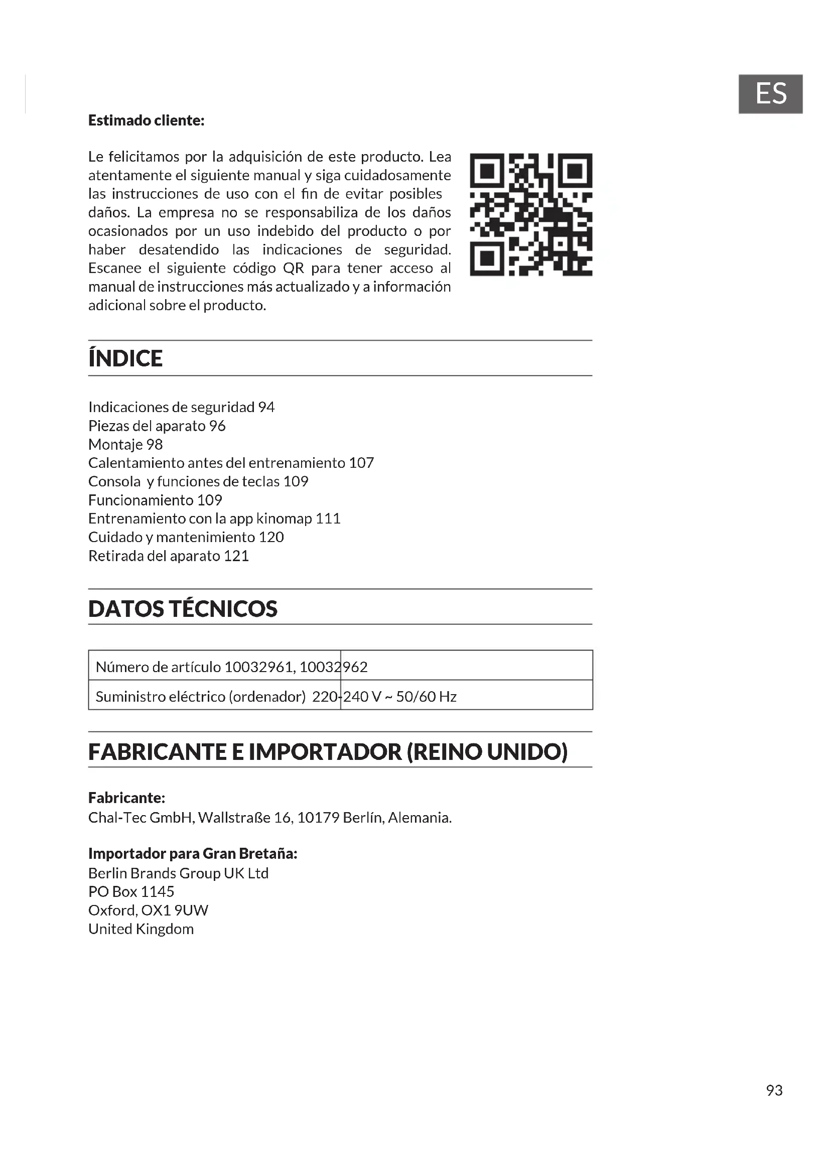 Estimado cliente: Le felicitamos por la adquisición de este producto. Lea atentamente el siguiente manual y siga cuidadosamente las instrucciones de uso con el n de evitar posibles daños. La empresa no se responsabiliza de los daños ocasionados por un uso indebido del producto o por haber desatendido las indicaciones de seguridad. Escanee el siguiente código QR para tener acceso al manual de instrucciones más actualizado y a información adicional sobre el producto. ÍNDICE Indicaciones de seguridad 94 Piezas del aparato 96 Montaje 98 Calentamiento antes del entrenamiento 107 Consola y funciones de teclas 109 Funcionamiento 109 Entrenamiento con la app kinomap 111 Cuidado y mantenimiento 120 Retirada del aparato 121
