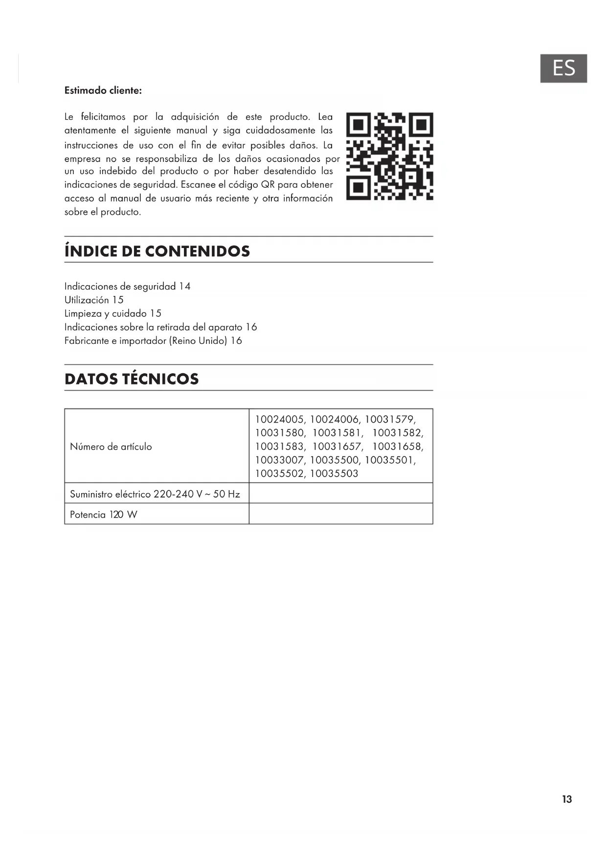 Indicaciones de seguridad14 Utilización15 Limpieza y cuidado15 Indicaciones sobre la retirada del aparato16 Fabricante e importador (Reino Unido)16