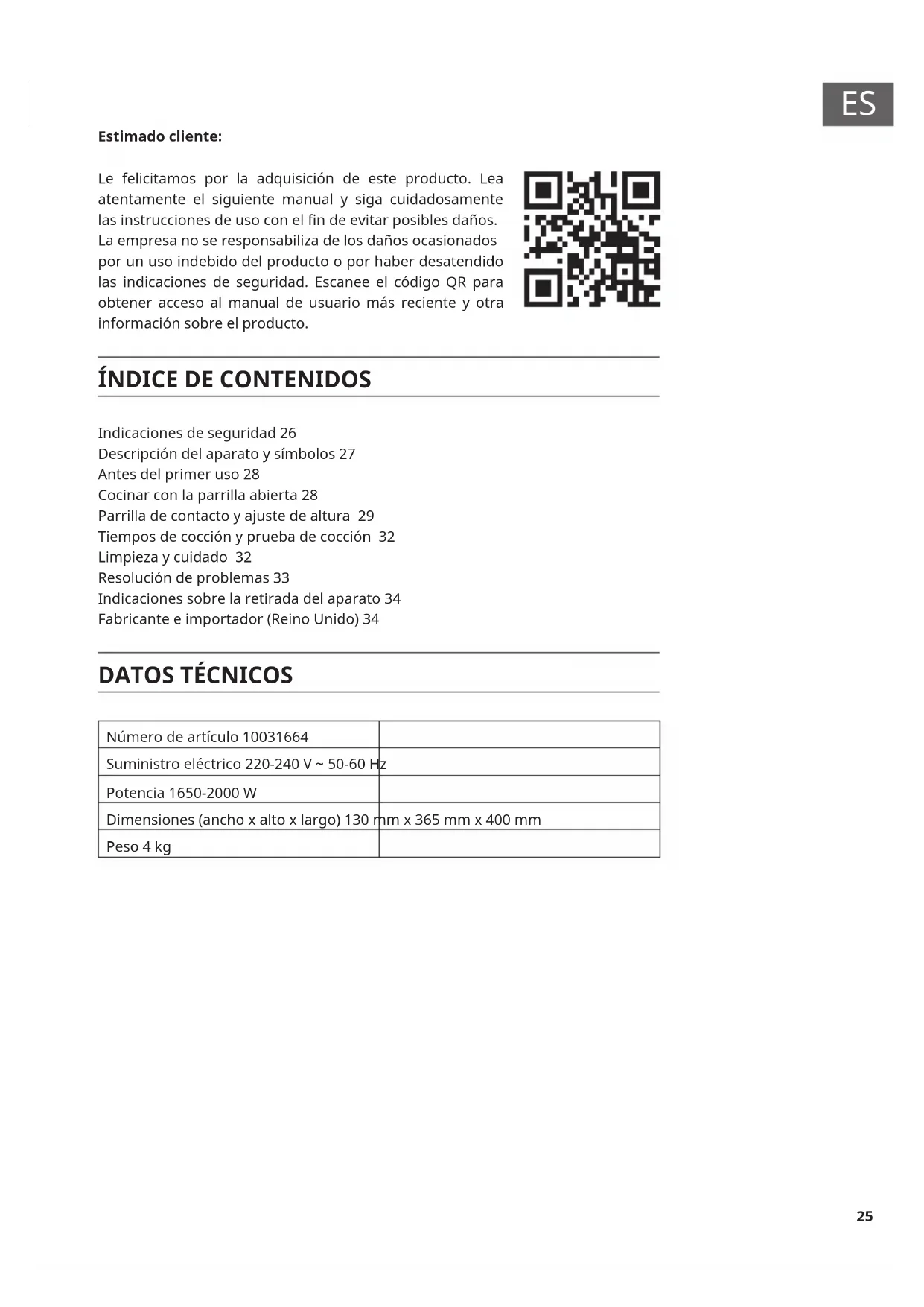 Indicaciones de seguridad 26 Descripción del aparato y símbolos 27 Antes del primer uso 28 Cocinar con la parrilla abierta 28 Parrilla de contacto y ajuste de altura 29 Tiempos de cocción y prueba de cocción 32 Limpieza y cuidado 32 Resolución de problemas 33 Indicaciones sobre la retirada del aparato 34 Fabricante e importador (Reino Unido) 34