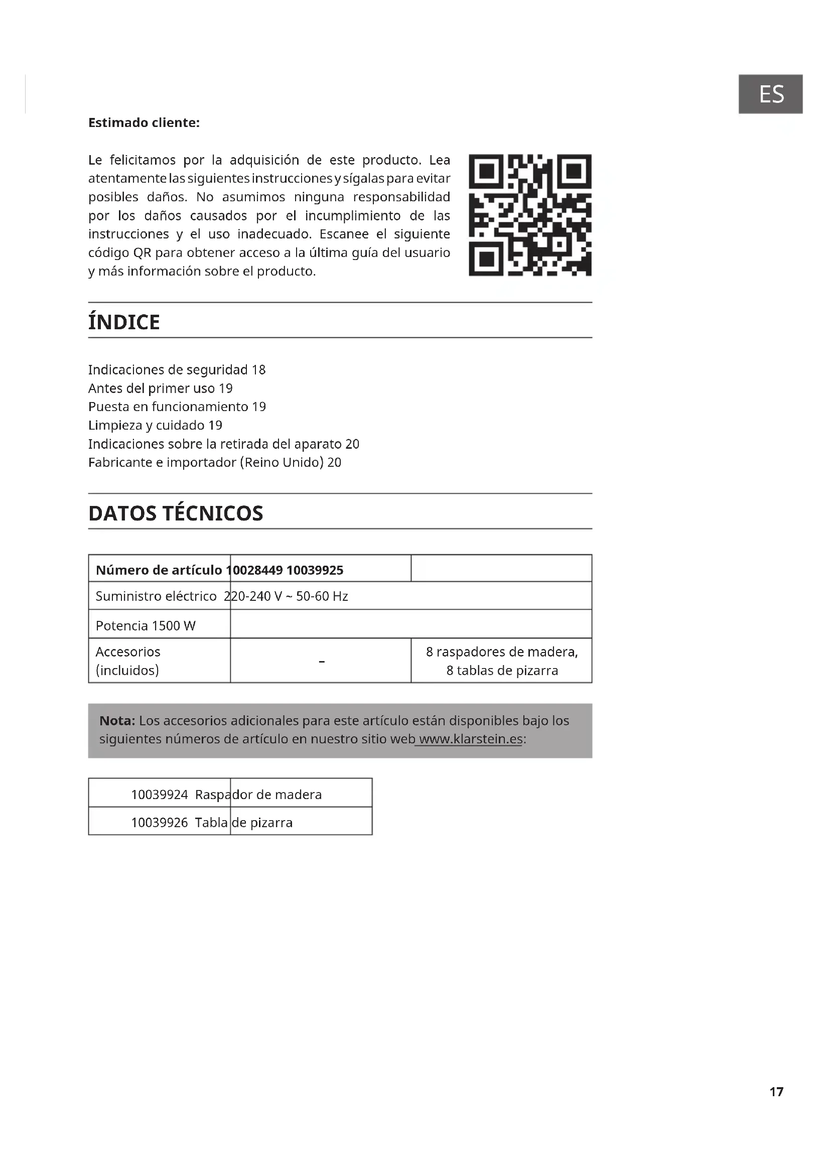 Estimado cliente: Le felicitamos por la adquisición de este producto. Lea atentamente las siguientes instrucciones y sígalas para evitar posibles daños. No asumimos ninguna responsabilidad por los daños causados por el incumplimiento de las instrucciones y el uso inadecuado. Escanee el siguiente código QR para obtener acceso a la última guía del usuario y más información sobre el producto. ÍNDICE Indicaciones de seguridad 18 Antes del primer uso 19 Puesta en funcionamiento 19 Limpieza y cuidado 19 Indicaciones sobre la retirada del aparato 20 Fabricante e importador (Reino Unido) 20