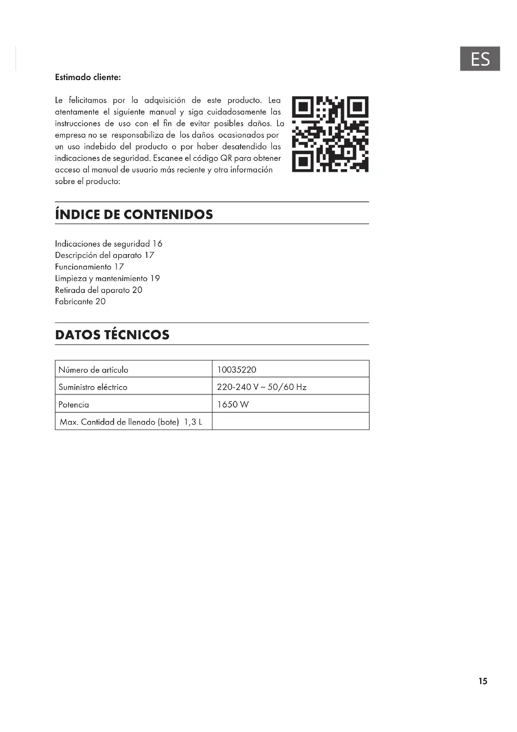 Indicaciones de seguridad16 Descripción del aparato17 Funcionamiento17 Limpieza y mantenimiento19 Retirada del aparato20 Fabricante20