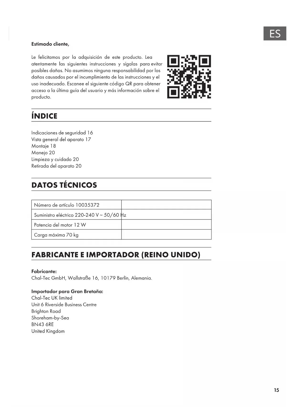 Estimado cliente, Le felicitamos por la adquisición de este producto. Lea atentamente las siguientes instrucciones y sígalas para evitar posibles daños. No asumimos ninguna responsabilidad por los daños causados por el incumplimiento de las instrucciones y el uso inadecuado. Escanee el siguiente código QR para obtener acceso a la última guía del usuario y más información sobre el producto. ÍNDICE Indicaciones de seguridad16 Vista general del aparato17 Montaje18 Manejo20 Limpieza y cuidado20 Retirada del aparato20