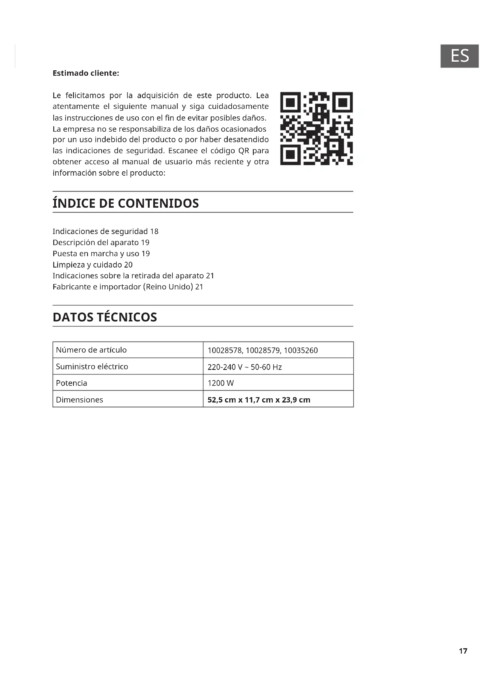 Número de artículo 10028578, 10028579, 10035260 Suministro eléctrico 220-240 V ~ 50-60 Hz Potencia 1200 W Dimensiones 52,5 cm x 11,7 cm x 23,9 cm18
