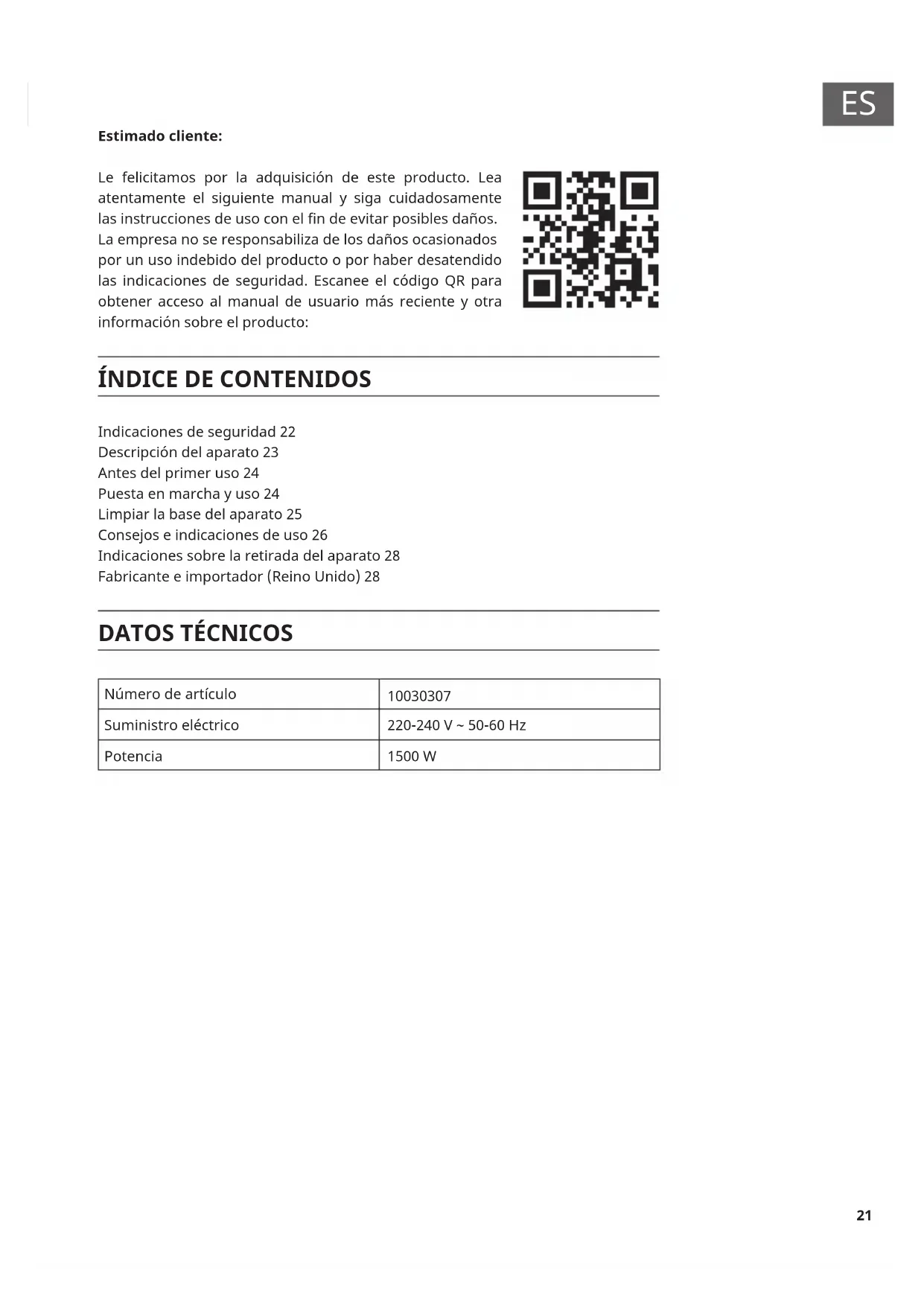 Indicaciones de seguridad 22 Descripción del aparato 23 Antes del primer uso 24 Puesta en marcha y uso 24 Limpiar la base del aparato 25 Consejos e indicaciones de uso 26 Indicaciones sobre la retirada del aparato 28 Fabricante e importador (Reino Unido) 28