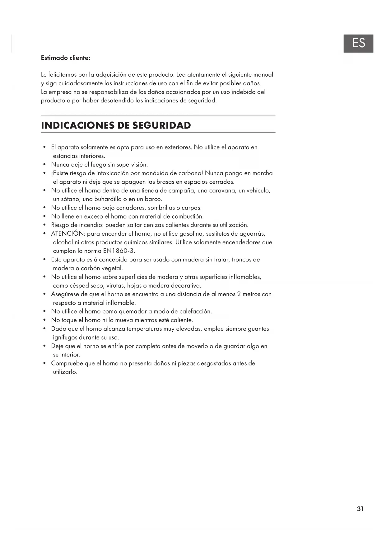 - ATENCION: para encender el hora, no utilise gasolina, sustitutos de aguarrás, alcohol nithers productos químicos similares. Utilice solamente encendedores que cumplan la norma EN1860-3.