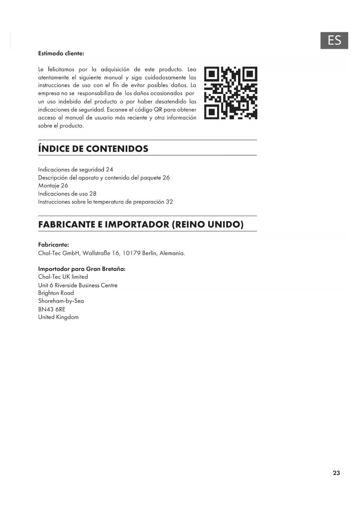 Indicaciones de seguridad24 Descripción del aparato y contenido del paquete26 Montaje26 Indicaciones de uso28 Instrucciones sobre la temperatura de preparación32 FABRICANTE E IMPORTADOR (REINO UNIDO) Fabricante: Chal-Tec GmbH, Wallstraße 16, 10179 Berlín, Alemania. Importador para Gran Bretaña: Chal-Tec UK limited Unit 6 Riverside Business Centre Brighton Road Shoreham-by-Sea BN43 6RE United Kingdom24