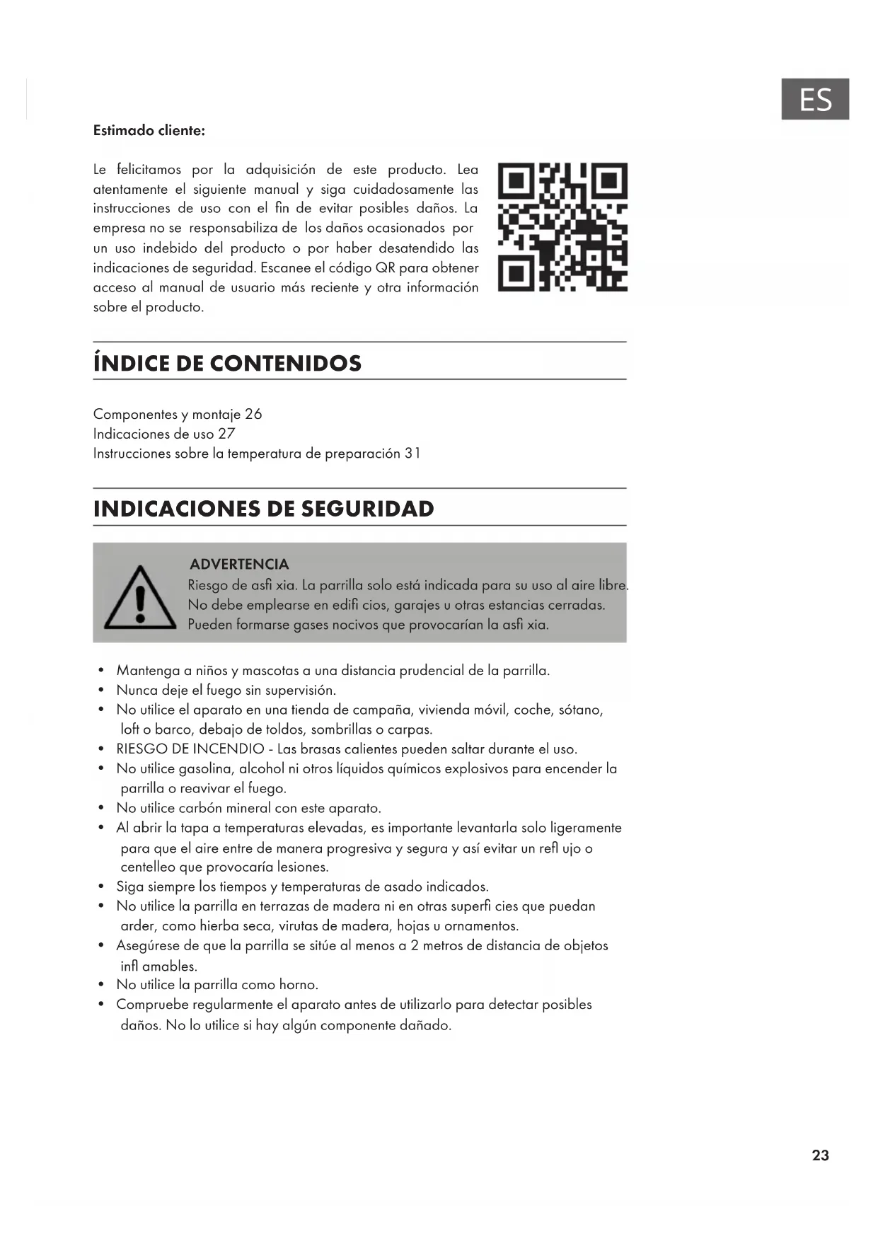 ADVERTENCIA Riesgo de as xia. La parrilla solo está indicada para su uso al aire libre. No debe emplearse en edi cios, garajes u otras estancias cerradas. Pueden formarse gases nocivos que provocarían la as xia.