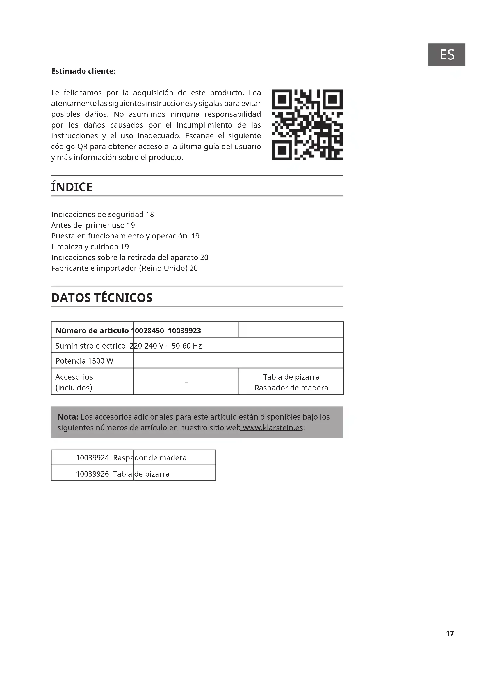 Estimado cliente: Le felicitamos por la adquisición de este producto. Lea atentamente las siguientes instrucciones y sígalas para evitar posibles daños. No asumimos ninguna responsabilidad por los daños causados por el incumplimiento de las instrucciones y el uso inadecuado. Escanee el siguiente código QR para obtener acceso a la última guía del usuario y más información sobre el producto. ÍNDICE Indicaciones de seguridad 18 Antes del primer uso 19 Puesta en funcionamiento y operación. 19 Limpieza y cuidado 19 Indicaciones sobre la retirada del aparato 20 Fabricante e importador (Reino Unido) 20