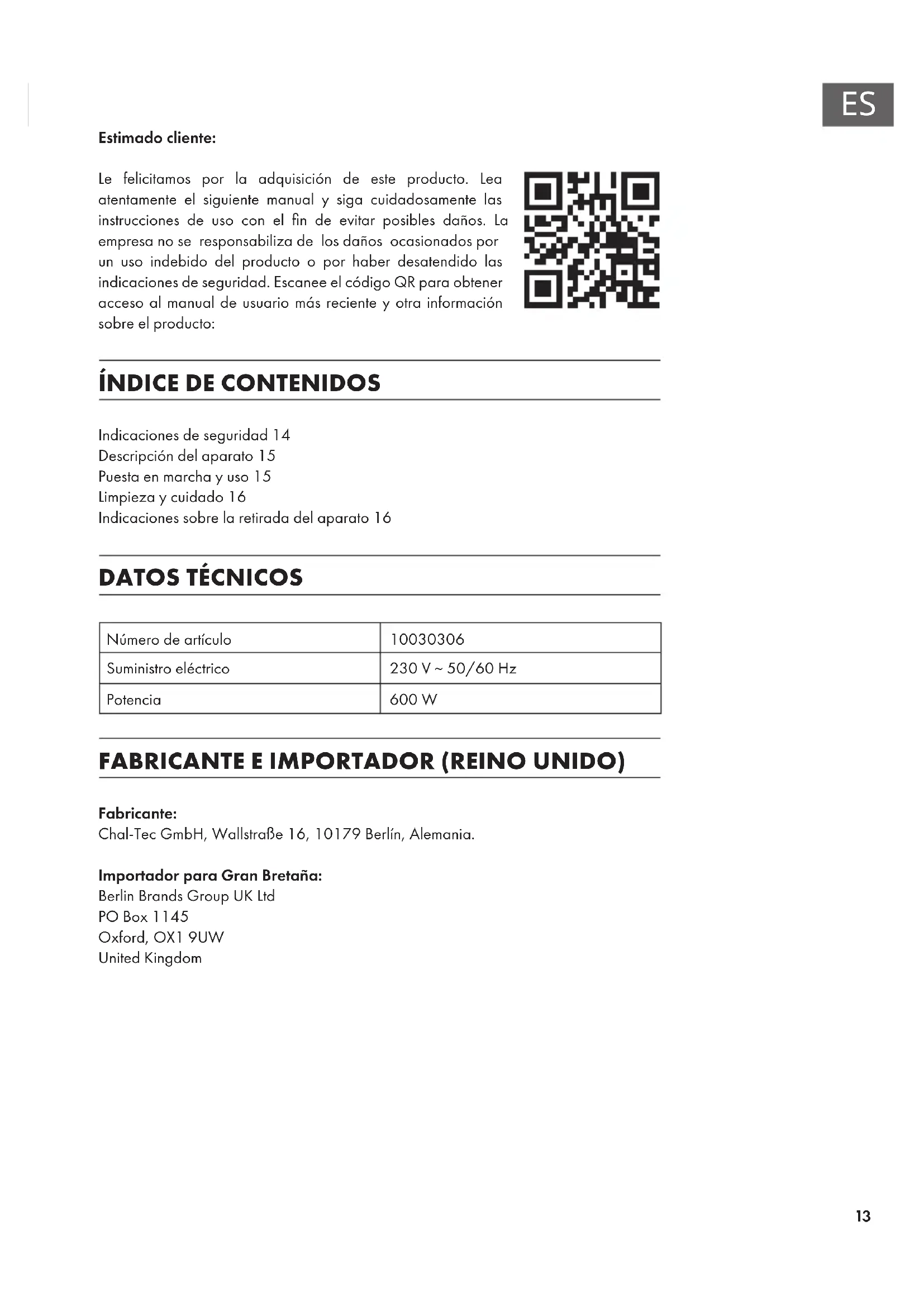 Estimado cliente: Le felicitamos por la adquisición de este producto. Lea atentamente el siguiente manual y siga cuidadosamente las instrucciones de uso con el n de evitar posibles daños. La empresa no se responsabiliza de los daños ocasionados por un uso indebido del producto o por haber desatendido las indicaciones de seguridad. Escanee el código QR para obtener acceso al manual de usuario más reciente y otra información sobre el producto: