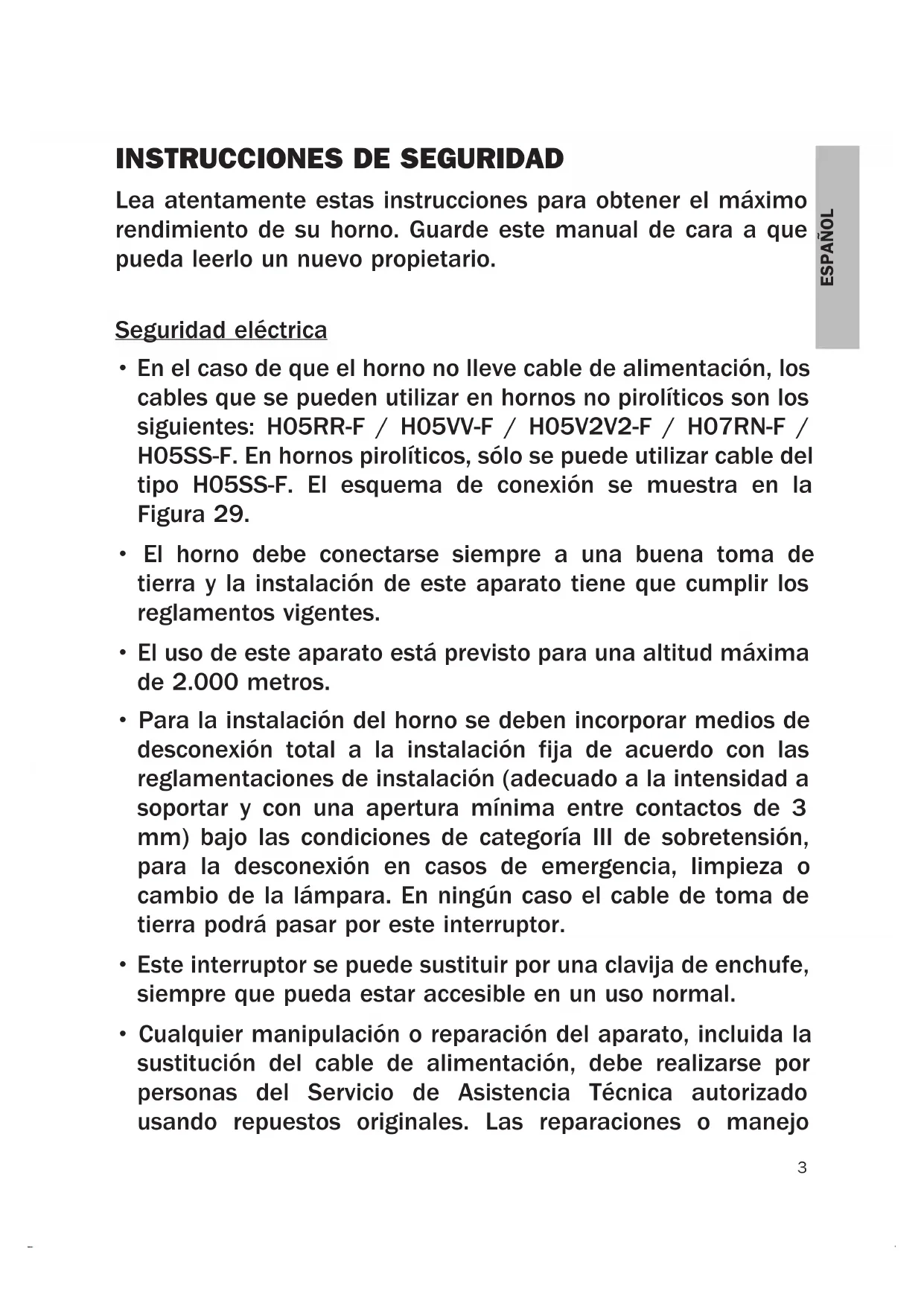 - En el caso de que el horno no lleve cable de alimentación, los cables que se pueden utilizar en hornos no pirolíticos son los siguientes: H05RR-F / H05VV-F / H05V2V2-F / H07RN-F / H05SS-F. En hornos pirolíticos, sólo se puede utilizar cable del tipo H05SS-F. El esquema de conexión se muestra en la Figura 29.