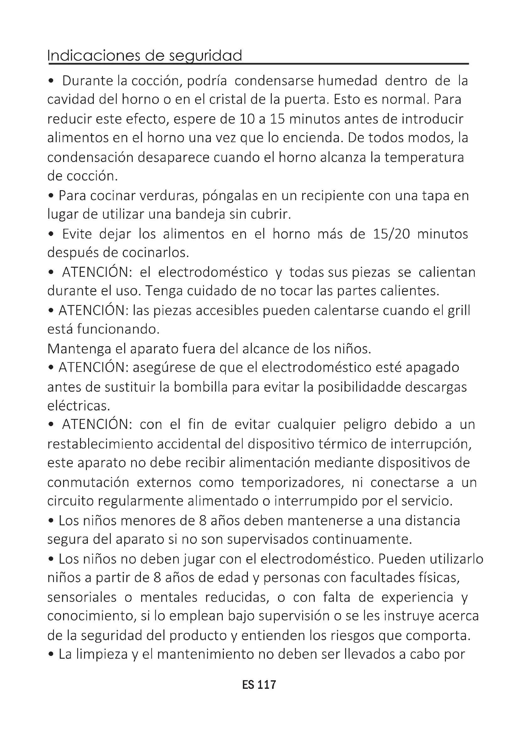 - Los niños no deben jugar con el electrodoméstico. Pueden utilizarlo niños a partir de 8 años de edad y personas con facultades físicas, sensoriales o mentales reducidas, o con falta de experiencia y conocimiento, si lo emplean bajo supervisión o se les instruye acerca de la seguridad del producto y entienden los riesgos que comporta. ES 117niños sin supervisión.