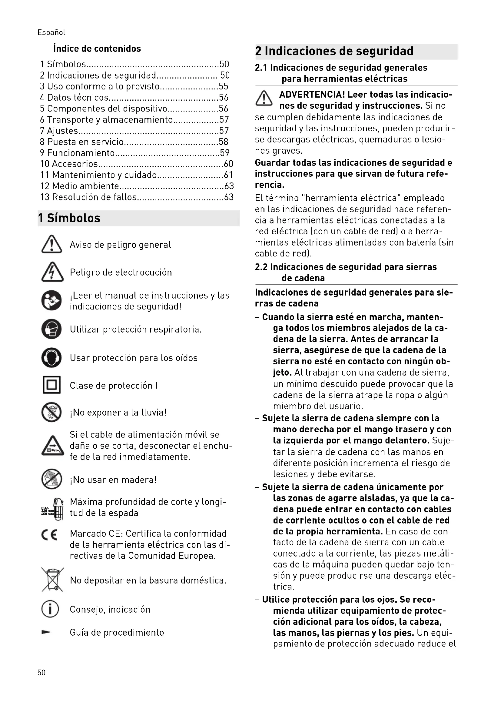 - 13 Risoluzione dei problemi 1 Simboli Avvertenza di pericolo generico Avvertenza sulle scariche elettriche Leggere le istruzioni d'uso e le avver tenze di sicurezza. Indossare un dispositivo di protezione delle vie respiratorie. Indossare dispositivi di protezione del l'udito. Classe di protezione II Non esporla alla pioggia! In caso di danneggiamento o taglio del la linea di alimentazione mobile, scol legare immediatamente la spina dalla rete. Non utilizzabile per il legno! 330 mm max. 400 mm Max. profondità di taglio e lunghezza dello spadino Contrassegno CE: attesta la conformità dell’elettroutensile alle Direttive della Comunità Europea. Non smaltire tra i rifiuti domestici. Consiglio, avvertenza Istruzioni per l'uso 2 Avvertenze per la sicurezza p. 78