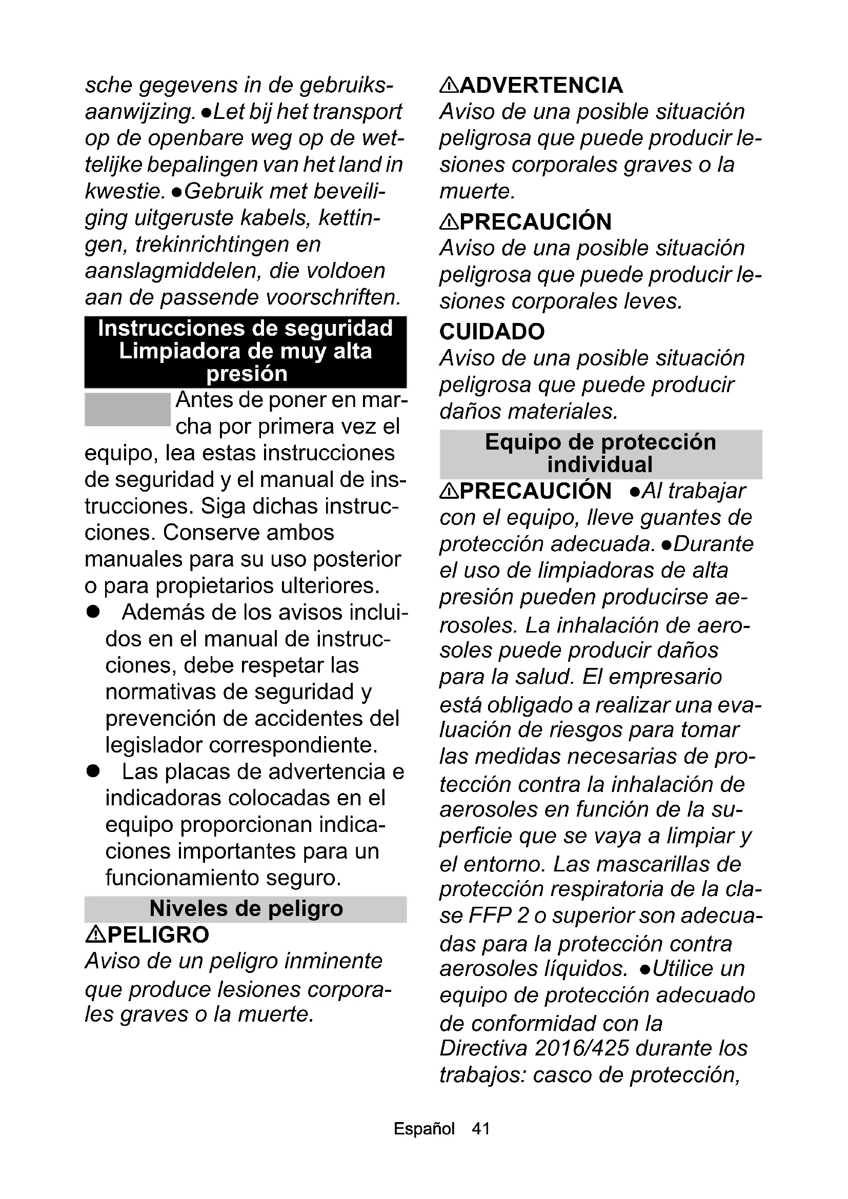 utilice mangueras de alta pre- sión que hayan sido aplastadas, dobladas o golpeadas, incluso cuando no sea visible ningún daño. Realice el tendido de las mangueras de alta presión de modo que no puedan ser aplas- tadas. La salida de fluidos pue- de provocar lesiones. No realice la búsqueda de fugas con las manos descubiertas. 몇 PRECAUCIÓN Almacene las mangueras de alta presión de forma que no se vean some- tidas a cargas mecánicas. Servicio PELIGRO La puesta en ser- vicio incorrecta de una limpiado- ra de muy alta presión es peligrosa y puede provocar le- siones y, en determinadas cir- cunstancias, incluso la muerte. Maneje el equipo únicamenteEspañol 45 cuando todas las tapas, cubier- tas y armarios eléctricos estén cerrados. Nunca deje el equipo sin supervisión durante el servi- cio. En caso de fallo en el sumi- nistro de energía, desconecte el equipo para evitar un arranque no controlado tras solucionar el fallo. Asegure el equipo contra usos no autorizados durante las pausas de trabajo. No trabaje con el equipo si se encuentra bajo los efectos de medicamen- tos o del alcohol. Asegure la zona de trabajo contra accesos no autorizados de forma clara- mente visible. Coloque rótulos de advertencia y barreras. En la zona de trabajo (en un radio de 10 m) solo puede encontrarse el operario. Asegúrese contra caídas con las medidas adecua- das durante los trabajos sobre andamios. Existe riesgo de caí- da por las fuerzas de retroceso. l Colóquese siempre sobre una base firme durante los tra- bajos. Debe permanecer siem- pre en una posición segura. Combine las boquillas y la pre- sión de servicio de modo que el operario pueda dominar le retro- ceso que se genera. La fuerza de retroceso no puede ser supe- rior a 250 N (25 kp). Utilice únicamente accesorios para la limpieza de tuberías con una marca que permita detectar de forma oportuna la salida de la boquilla. La distancia entre la boquilla y la marca debe ser de 500 mm. Introduzca los acce- sorios para la limpieza de tube- rías un mínimo de 500 mm en la tubería que se va a limpiar, an- tes de activar el chorro de alta presión. A la hora de utilizar el equipo en zonas de peligro (p. ej. gasolineras), tenga en cuenta las correspondientes re- glamentaciones de seguridad. Queda prohibido su uso en en- tornos explosivos. Nunca as- pire disolventes, líquidos que contenga disolventes ni ácidos no diluidos. Entre ellos, por ejemplo, gasolina, diluyentes o gasóleo para calefacción. La niebla de pulverización es infla- mable, explosiva y tóxica. 몇 ADVERTENCIA Elimine los riesgos inmediatamente. Ten- ga en cuenta la normativa nacio- nal de seguridad en el trabajo para los trabajos en salas cerra- das. El chorro de agua que sale del tubo pulverizador gene- ra una fuerza de retroceso. El acodamiento del tubo pulveriza- dor genera una fuerza hacia arriba. Sujete bien la pistola y el tubo pulverizador. No dirija el chorro de alta presión hacia sí mismo, por ejemplo, para lim- piar la ropa o el calzado. No dirija el chorro de alta presión hacia personas, animales, equi- pamiento eléctrico activo, ni46 Español apunte con él al propio equipo. No pulverice objetos que con- tengan sustancias perjudiciales para la salud (p. ej. amianto).